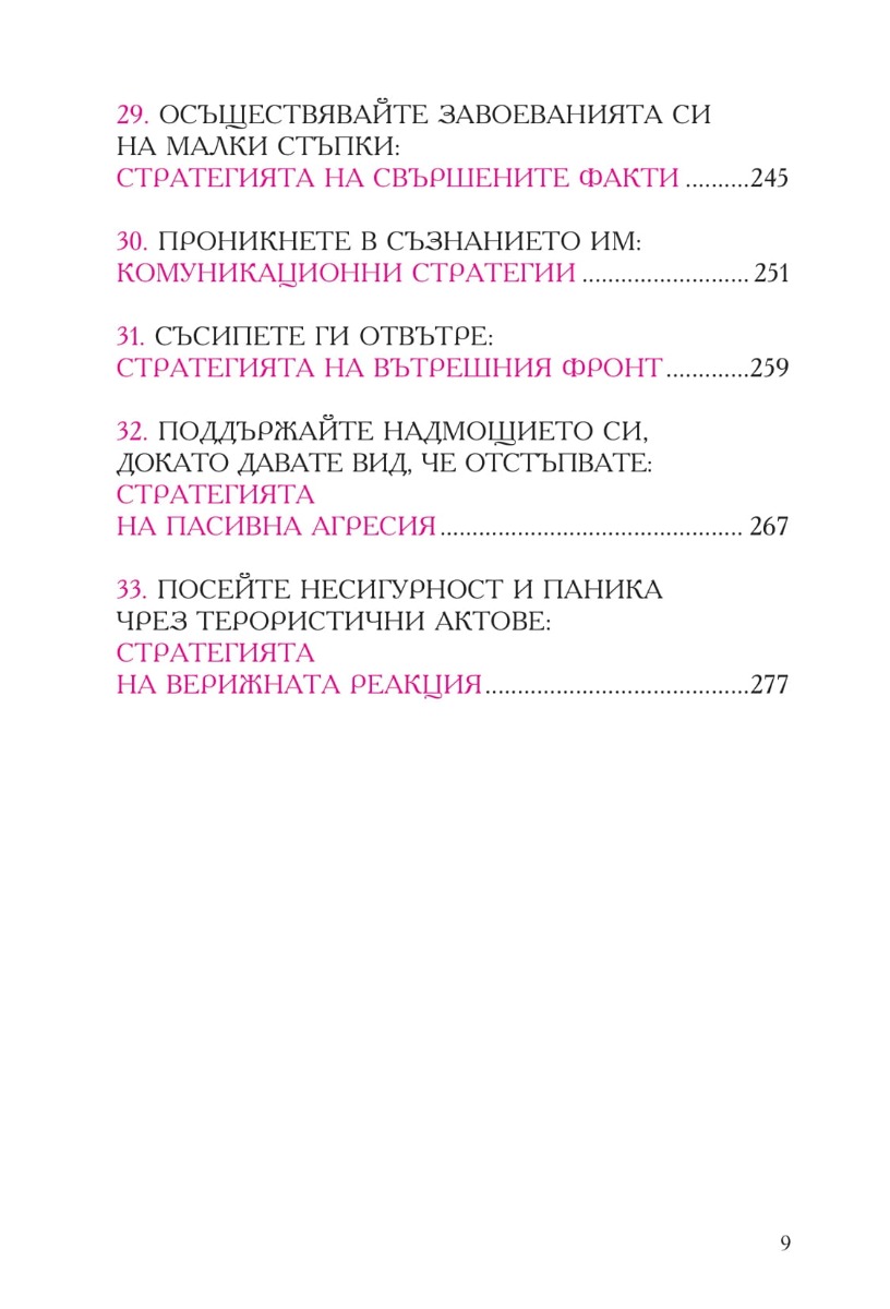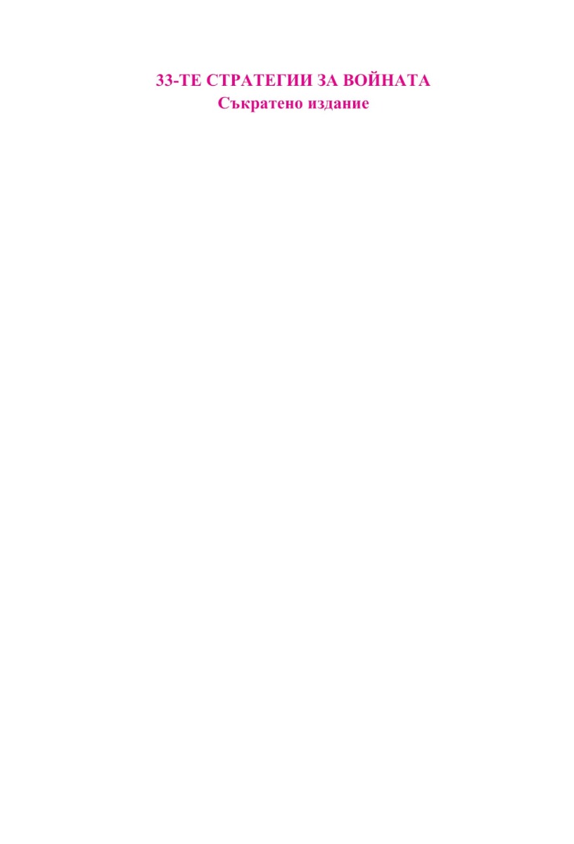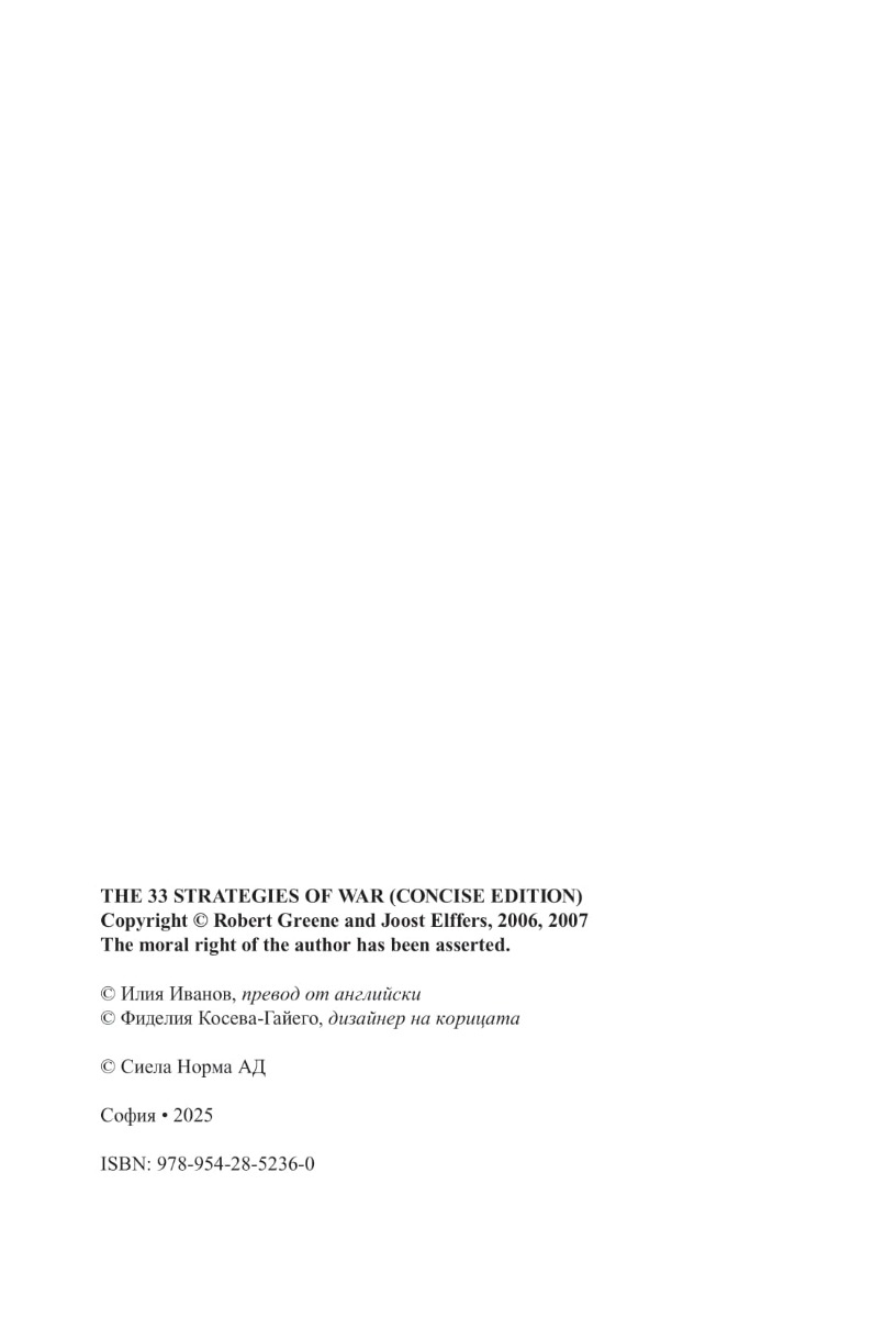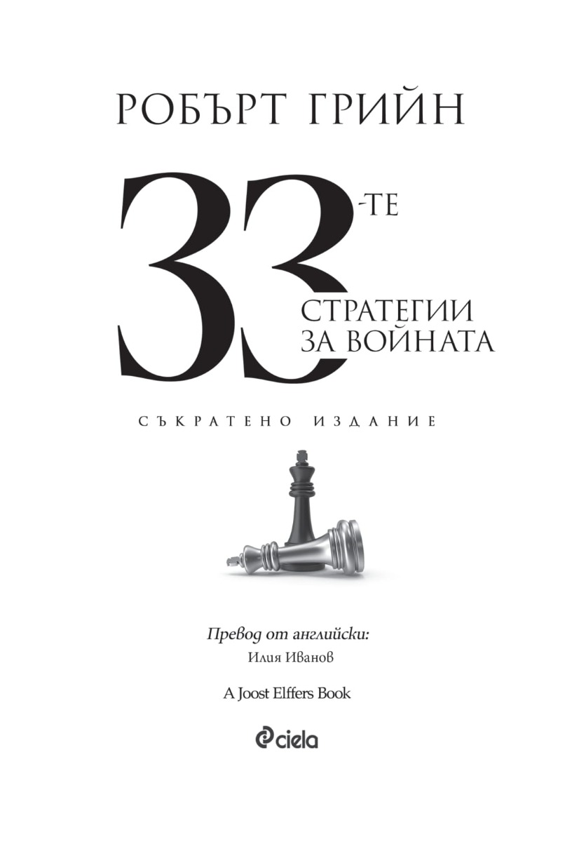 Последвайте легендарния стратег и автор на световния феномен „48-те закона на властта“ Робърт Грийн в това забележително съкратено издание на неговия друг шедьовър – „33-те стратегии за войната“. Тук ще откриете синтезирано знание, което помага да овладеем изкуството на завоеванието и опазването на спечеленото в съвременния свят.