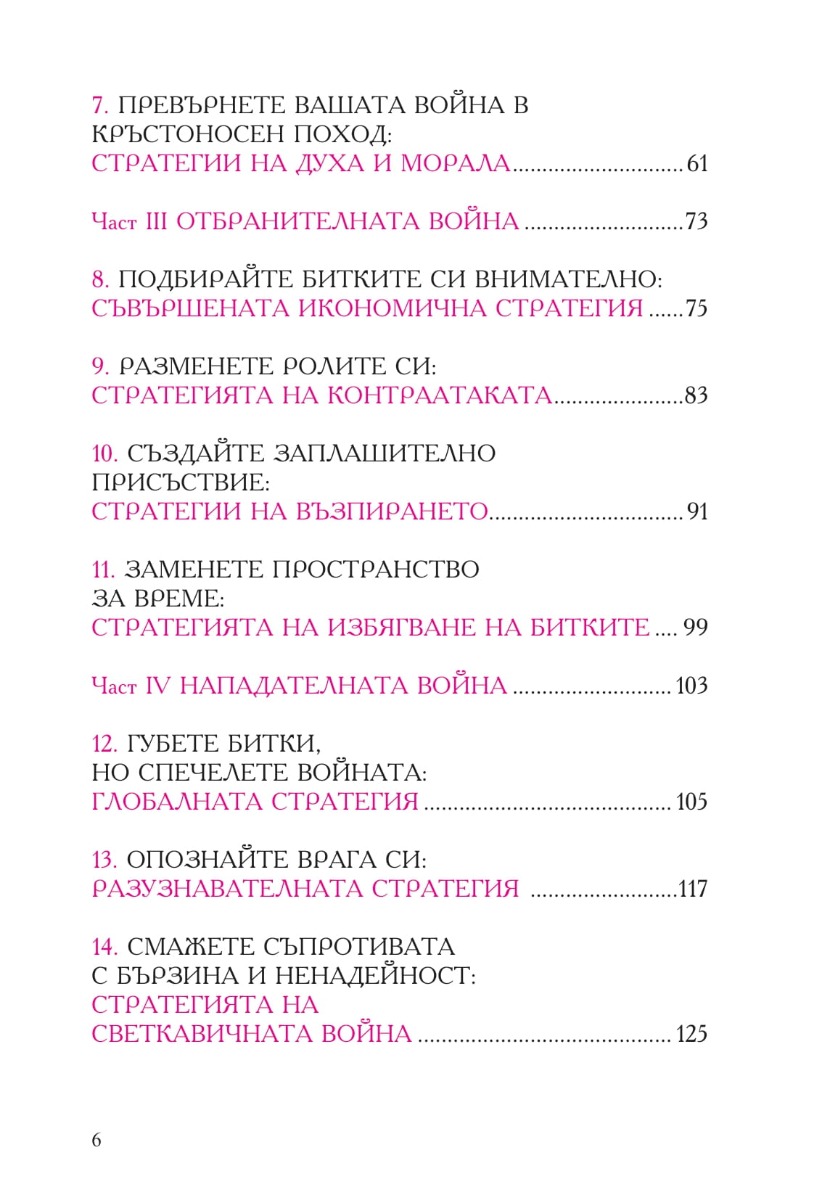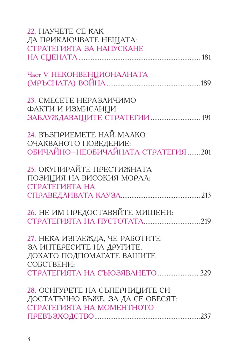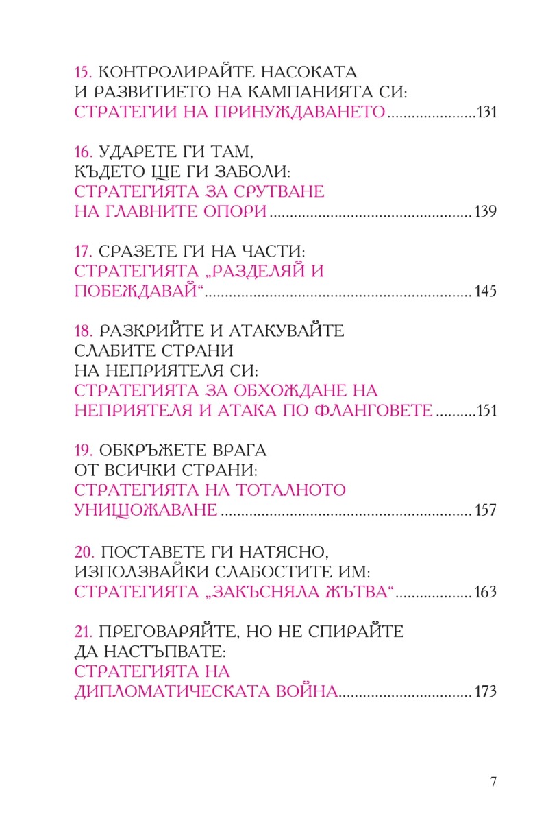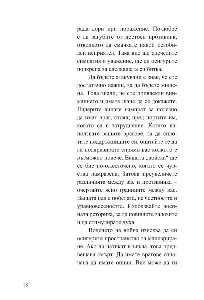 В тази кратка книга са събрани уроците на хилядолетията – от епични военни походи и решаващи политически сблъсъци до тихите лични битки, които водим всеки ден. Грийн вплита в изводите си прозренията на велики пълководци, държавници и мислители – от Сун Дзъ и Наполеон до Николо Макиавели и Фридрих Ницше – за да покаже как вечните принципи на стратегията са все така ключови за успеха.