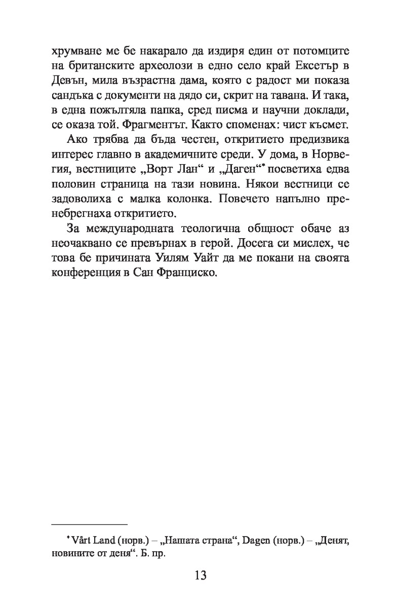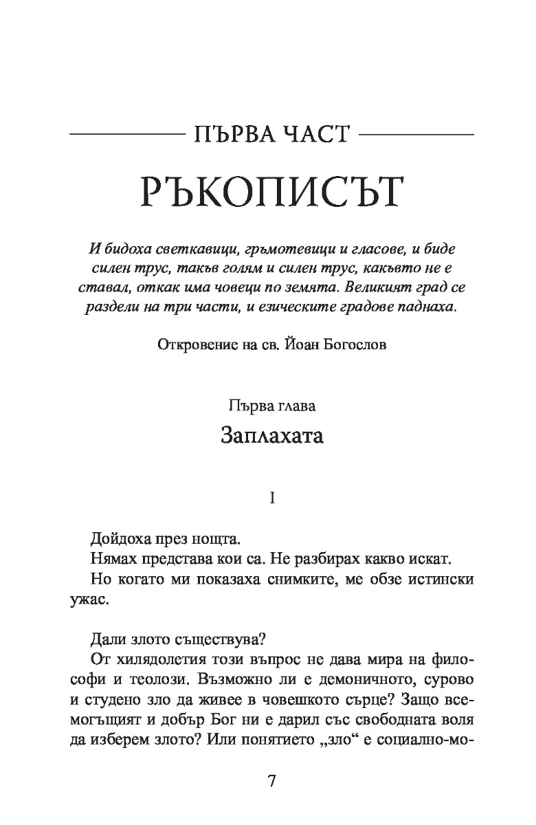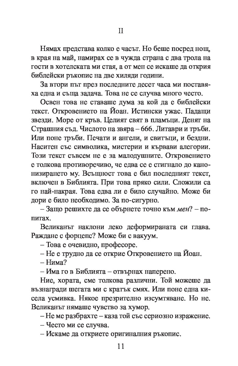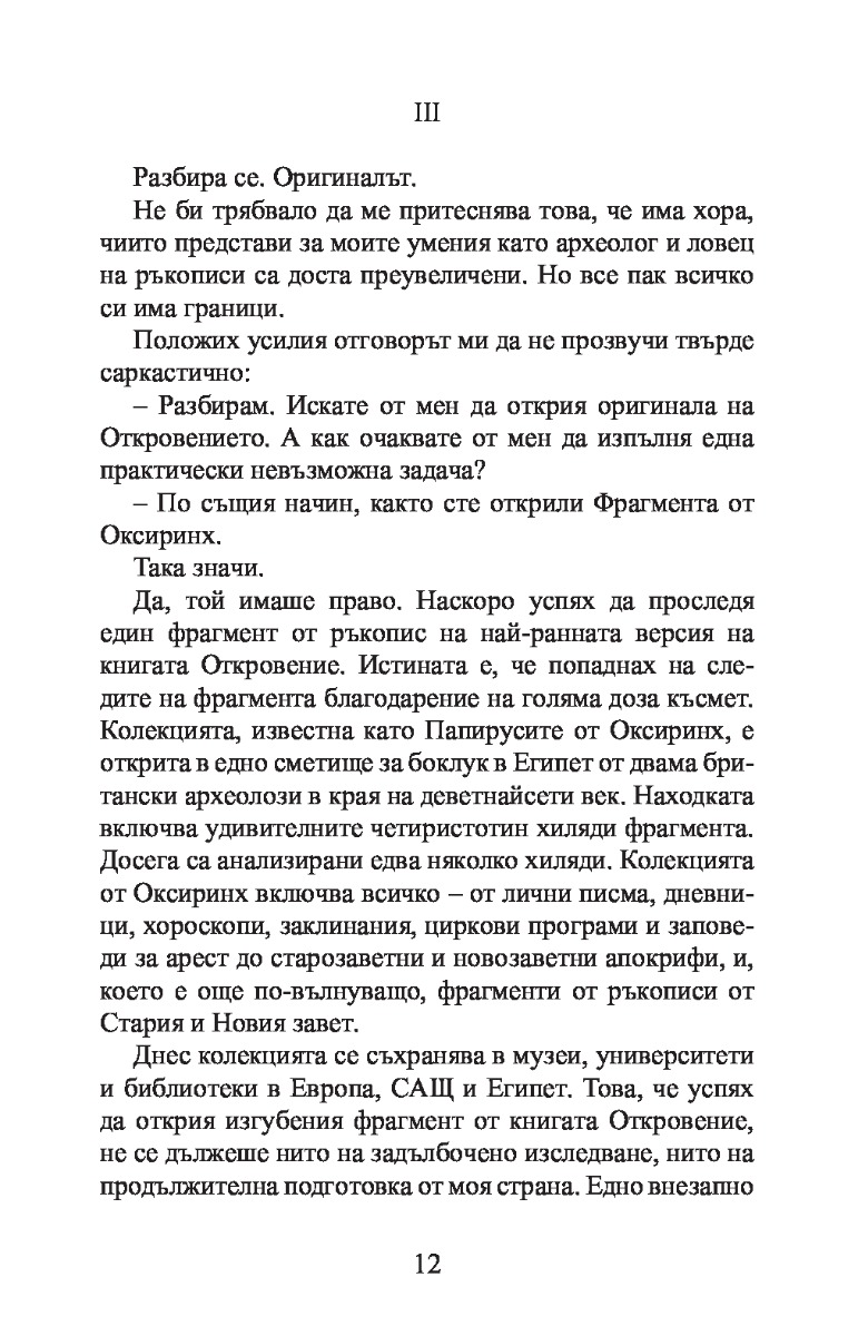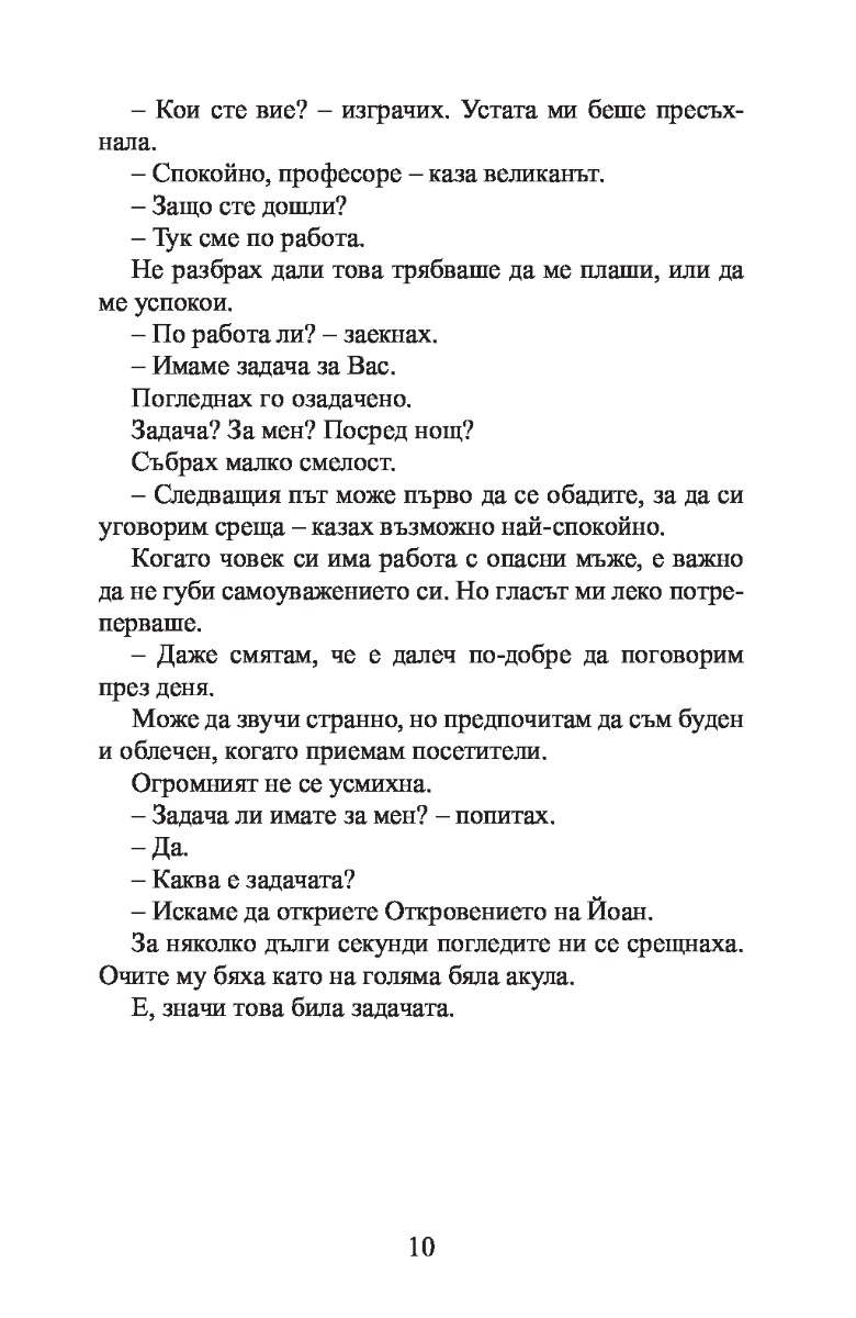 Проучването отвежда Бьорн по дирите на средновековно тайно общество, което се е разцепило на две фракции: едната днес се намира в Ирландия, а другата – в САЩ. Оригиналът на Откровението се оказва изключително ценен, защото съдържа неизвестни пасажи, които кодификаторите на Библията не са включили в каноничния текст.