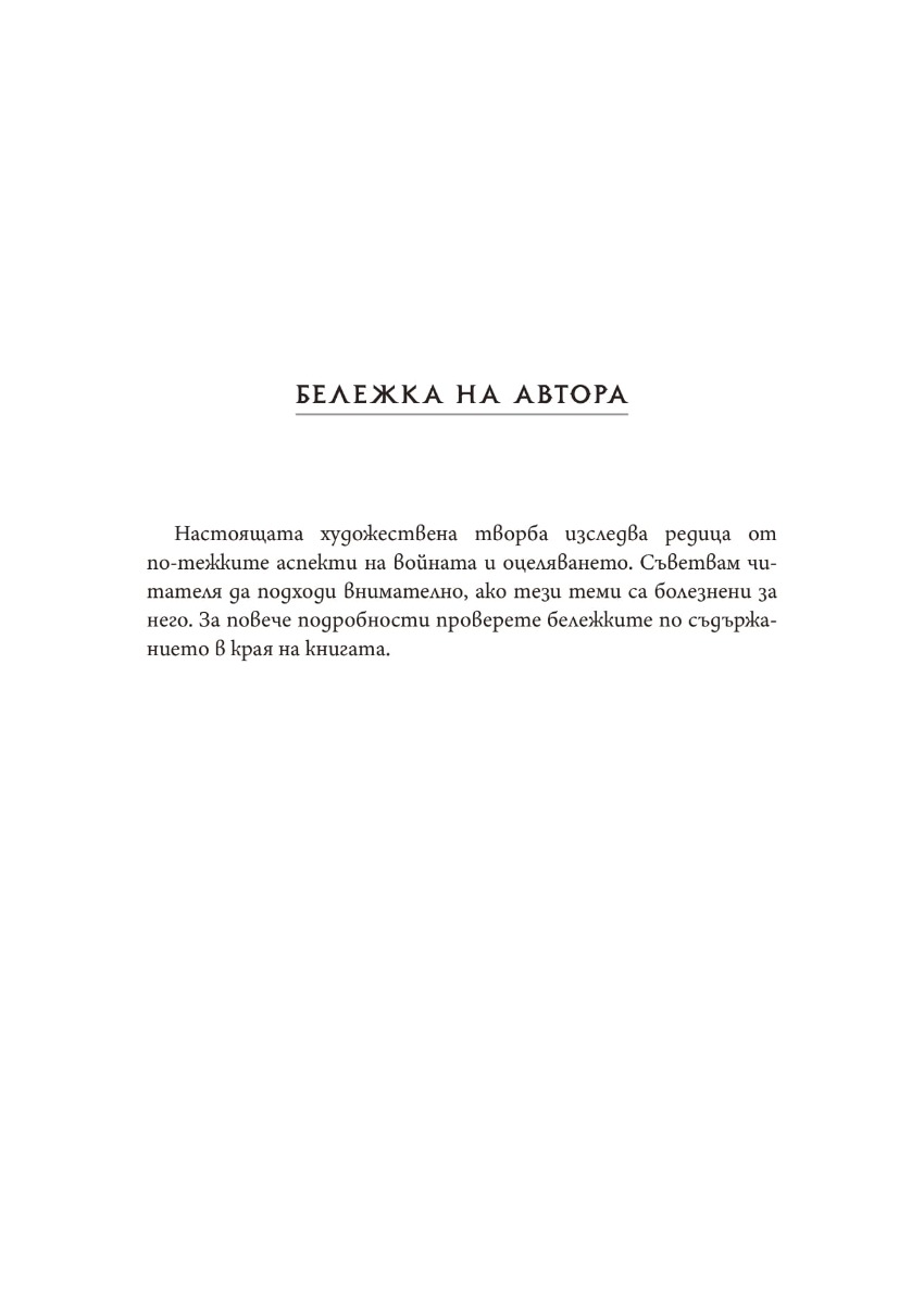 Предупреждения за съдържанието: Настоящата художествена творба изследва редица от най-тежките аспекти на войната и оцеляването. Съветваме ви да подходите внимателно, ако тези теми са болезнени за вас. За повече подробности, прочетете тук.