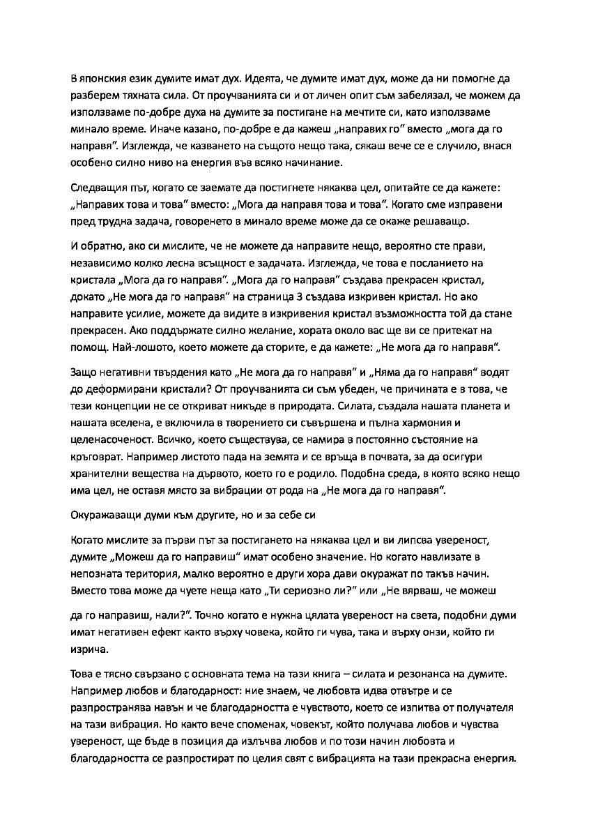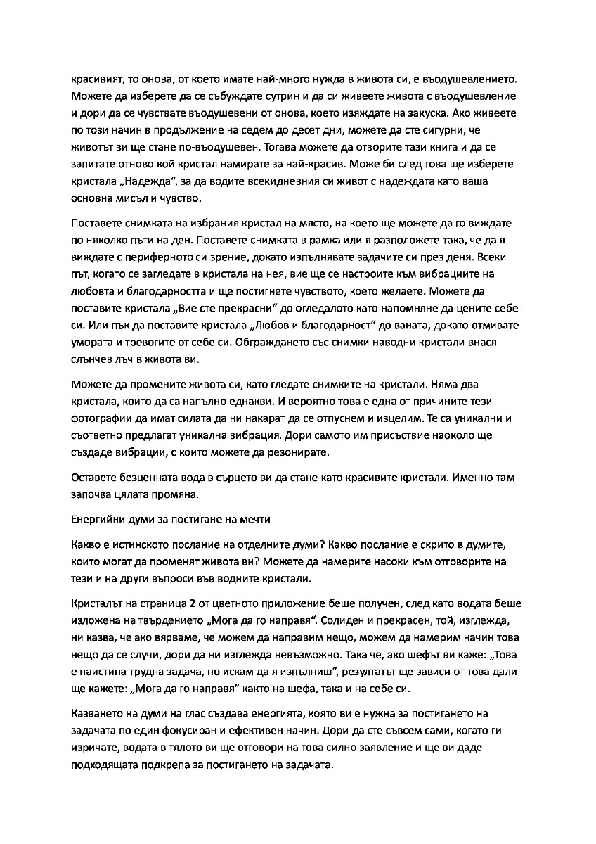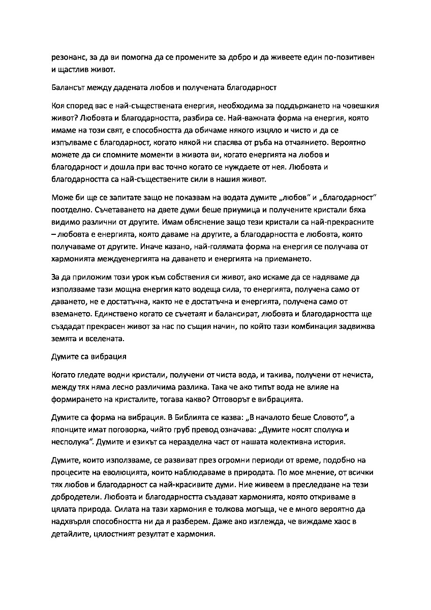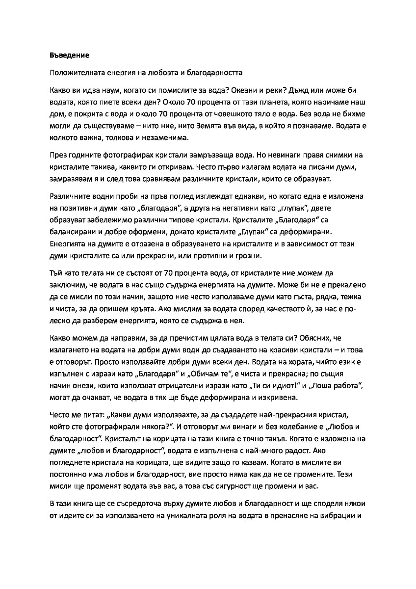 Тази задълбочена книга включва нови и необичайни фотографии на водни кристали, които предлагат убедителни причини да избираме позитивни думи и да се стремим към перфектен резонанс за един по-здравословен, спокоен и щастлив живот.