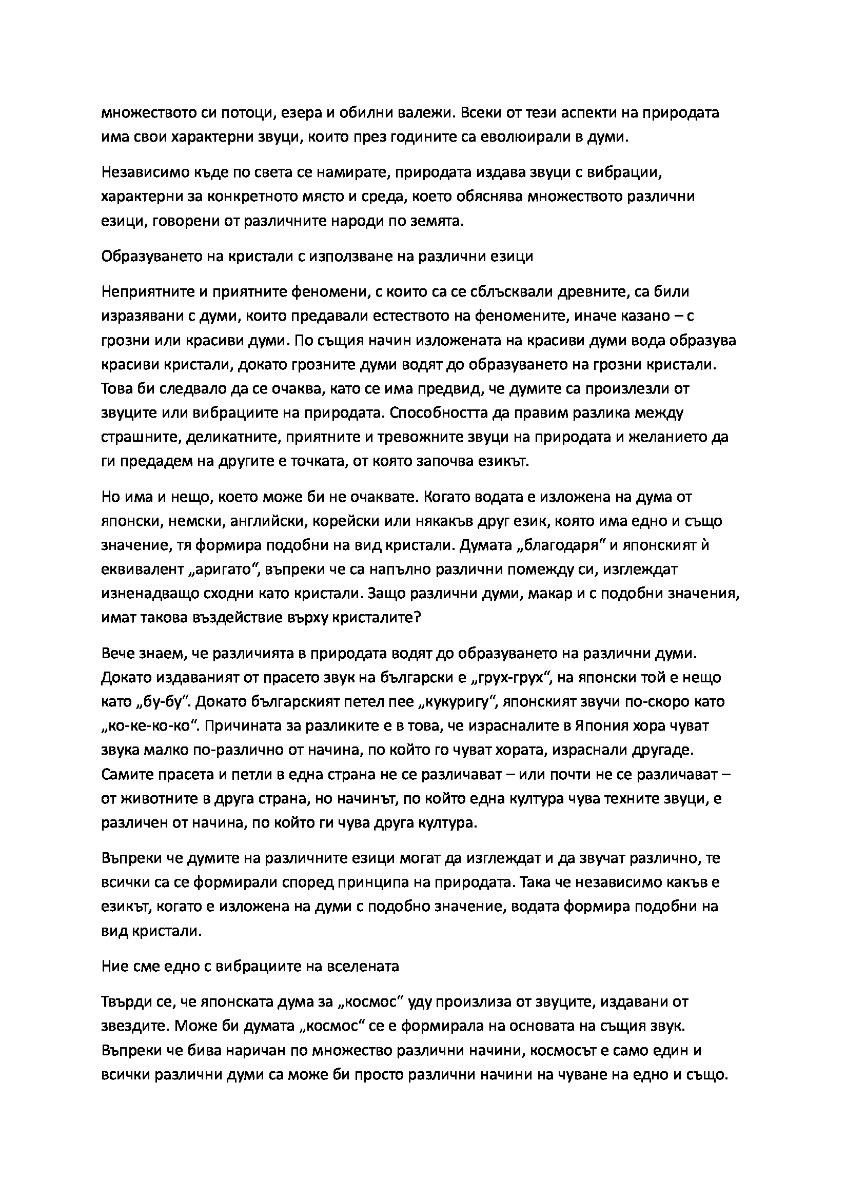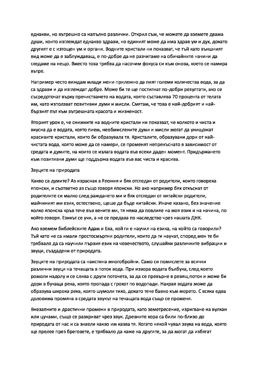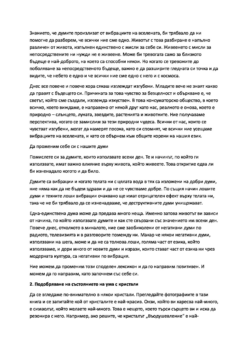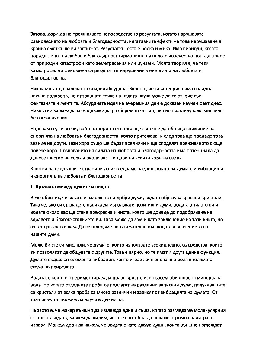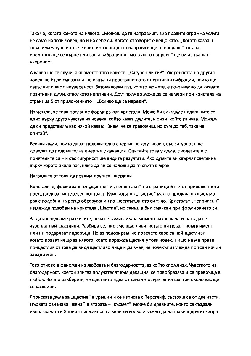 Тази задълбочена книга включва нови и необичайни фотографии на водни кристали, които предлагат убедителни причини да избираме позитивни думи и да се стремим към перфектен резонанс за един по-здравословен, спокоен и щастлив живот.