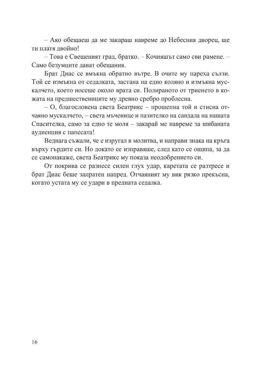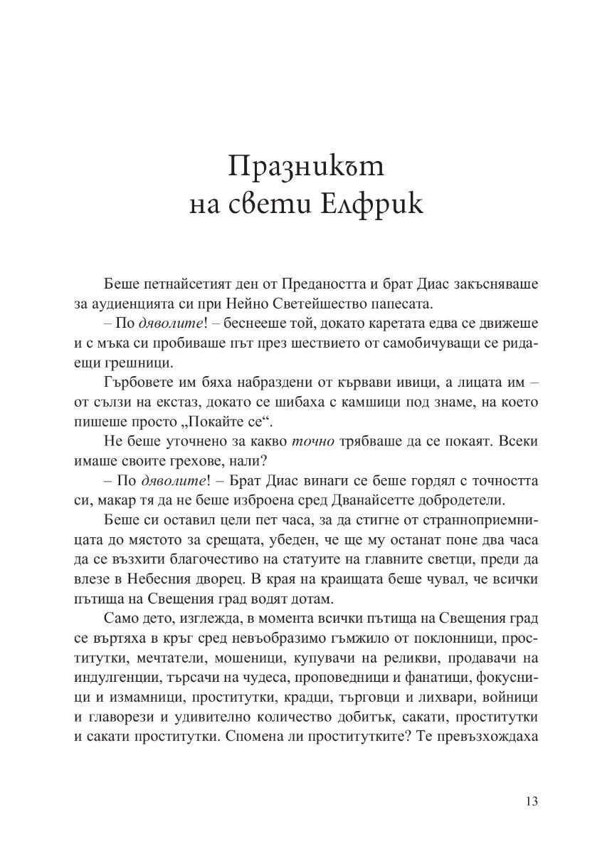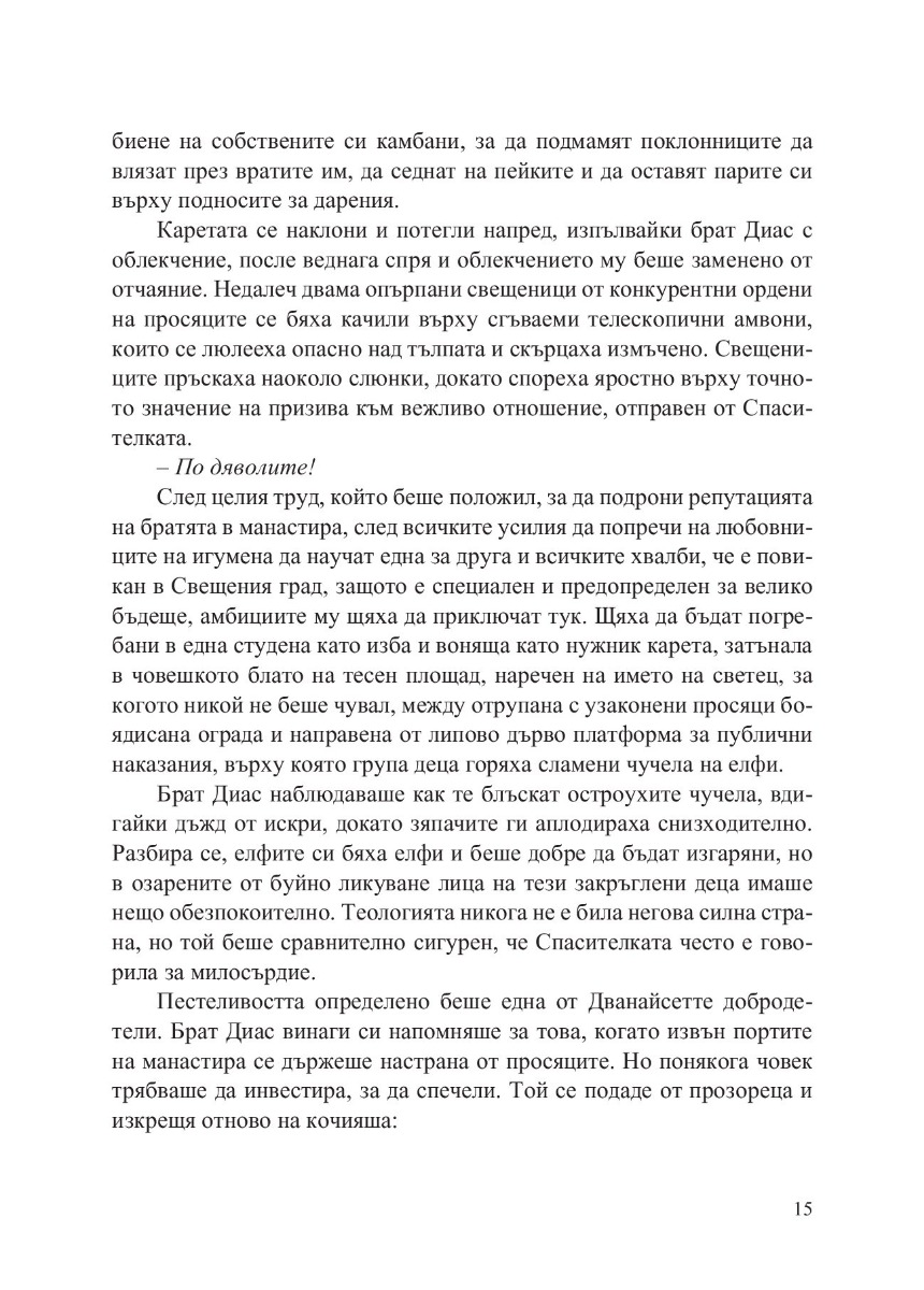 Достопочтеният брат Диас е призован в Свещения град, за да получи признание и висок пост в Църквата. Вместо това се оказва начело на свещен отряд от истински дяволи – прокълнат рицар тамплиер; вампир аристократ с безупречни маниери и кървави навици; върколачка с изявен вкус към човешкото месо; некромант, който дирижира трупове като симфония; полуневидима елфка, изпълнена с ненавист към хората; опитна убийца с мрачно минало. Тази абсурдна пасмина е окована в нерушимо папско заклинание да отведе една дръзка улична крадла до Троя, защото – как иначе? – тя е отдавна изгубената наследница на узурпирания от могъща магьосница Змийски трон.