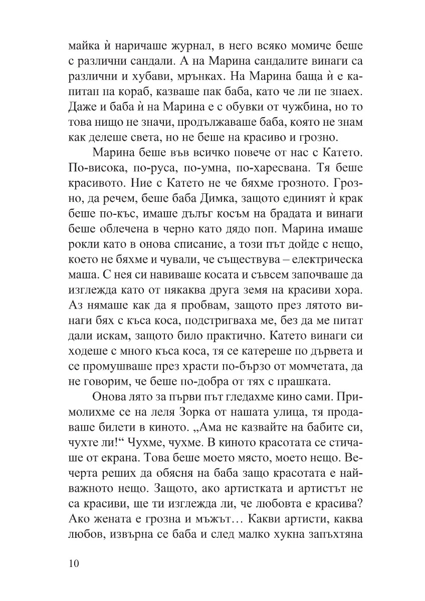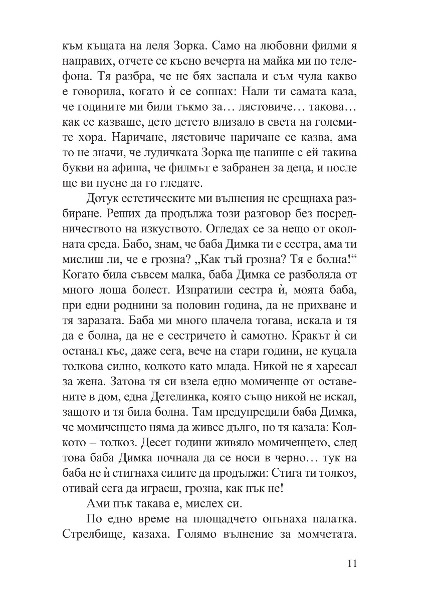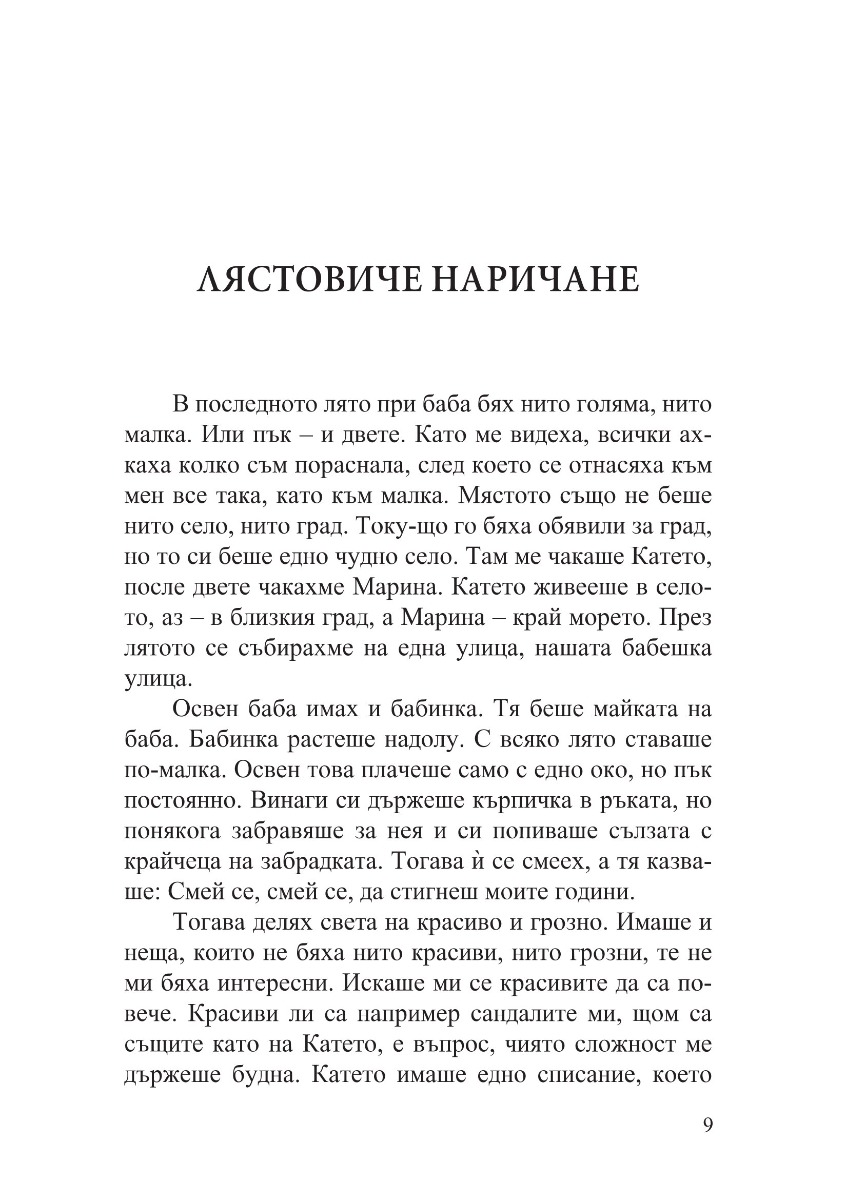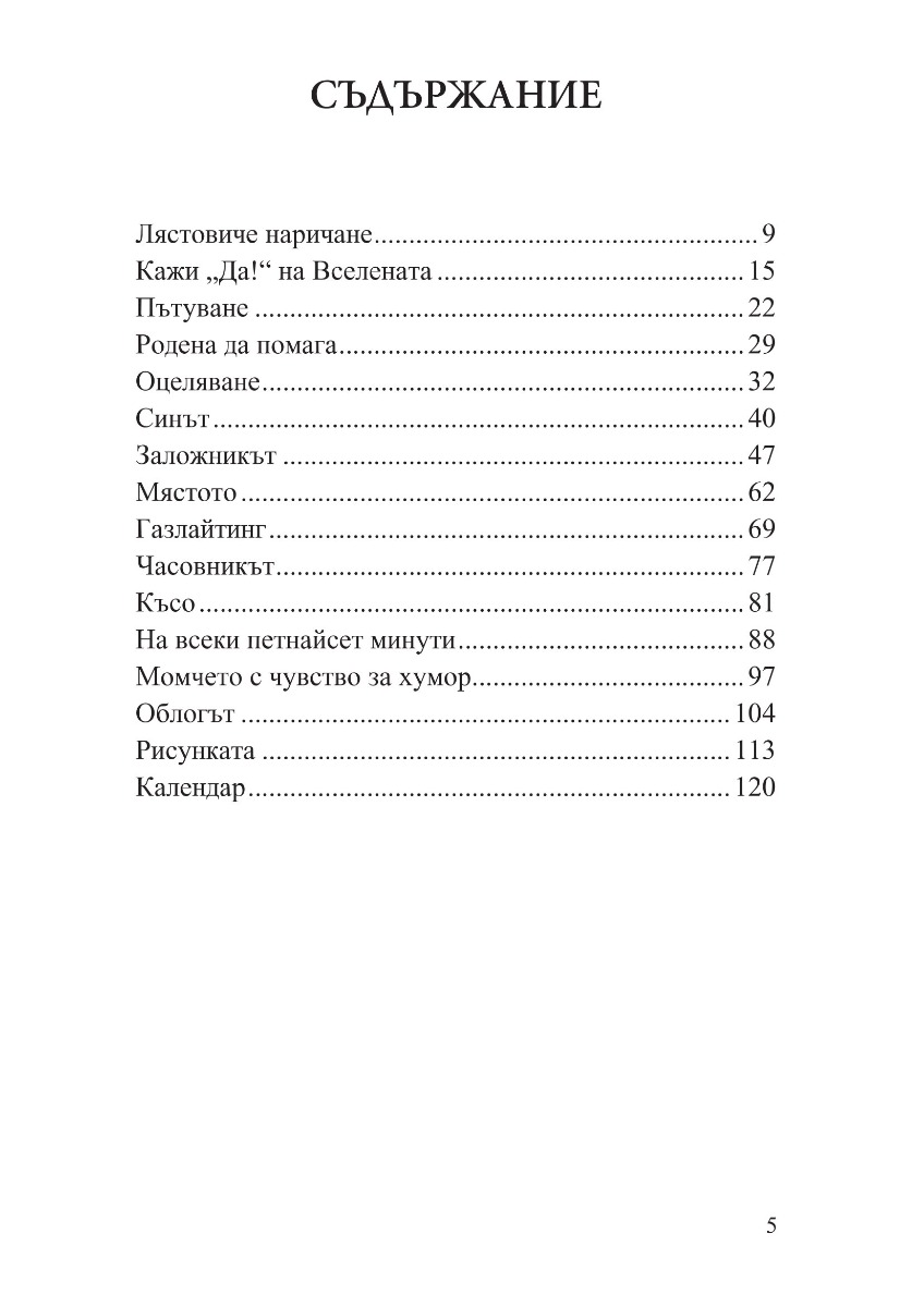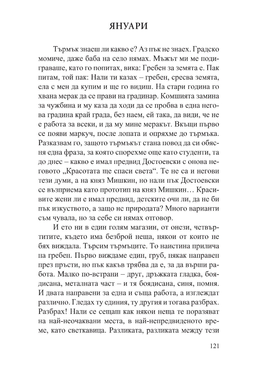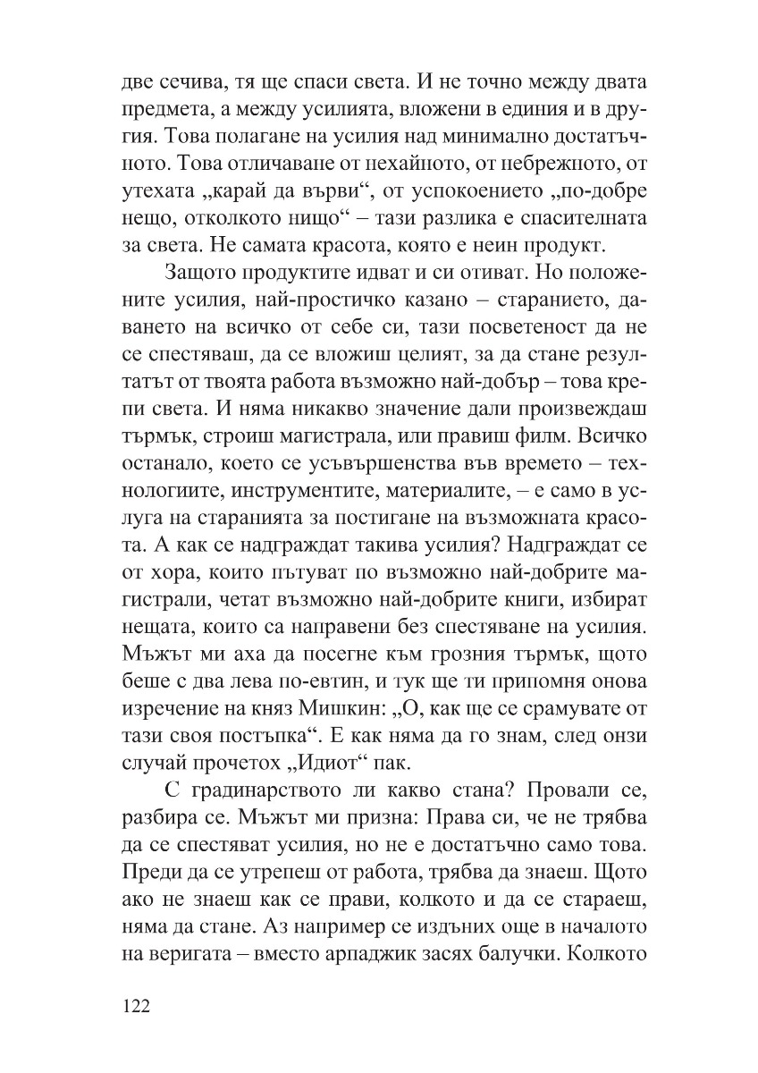 „Хората сме като тревата – не порастваме с дърпане“, мисли си една от героините в тези разкази, когато открива, че нещата не се учат с казване, а с живеене. Затова и тези разкази не проповядват и не съдят. Те водят душата по тайни пътеки, с тиха и стопляща човечност разкриват светове и провокират въпроси. В тези разкази човек може да чете списъци с цифри и да вижда богиня. Може да стои на едно място и пред него да се извърви целият живот. Може да открие красота и спасение в дизайна на един търмък. Защото красотата идва от желанието да се направи нещо по-добро от минимално достатъчното. Или както пише Веселина Седларска: „положените усилия, най-простичко казано – старанието, даването на всичко от себе си, тази посветеност да не се спестяваш, да се вложиш целият, за да стане резултатът от твоята работа възможно най-добър – това крепи света“.