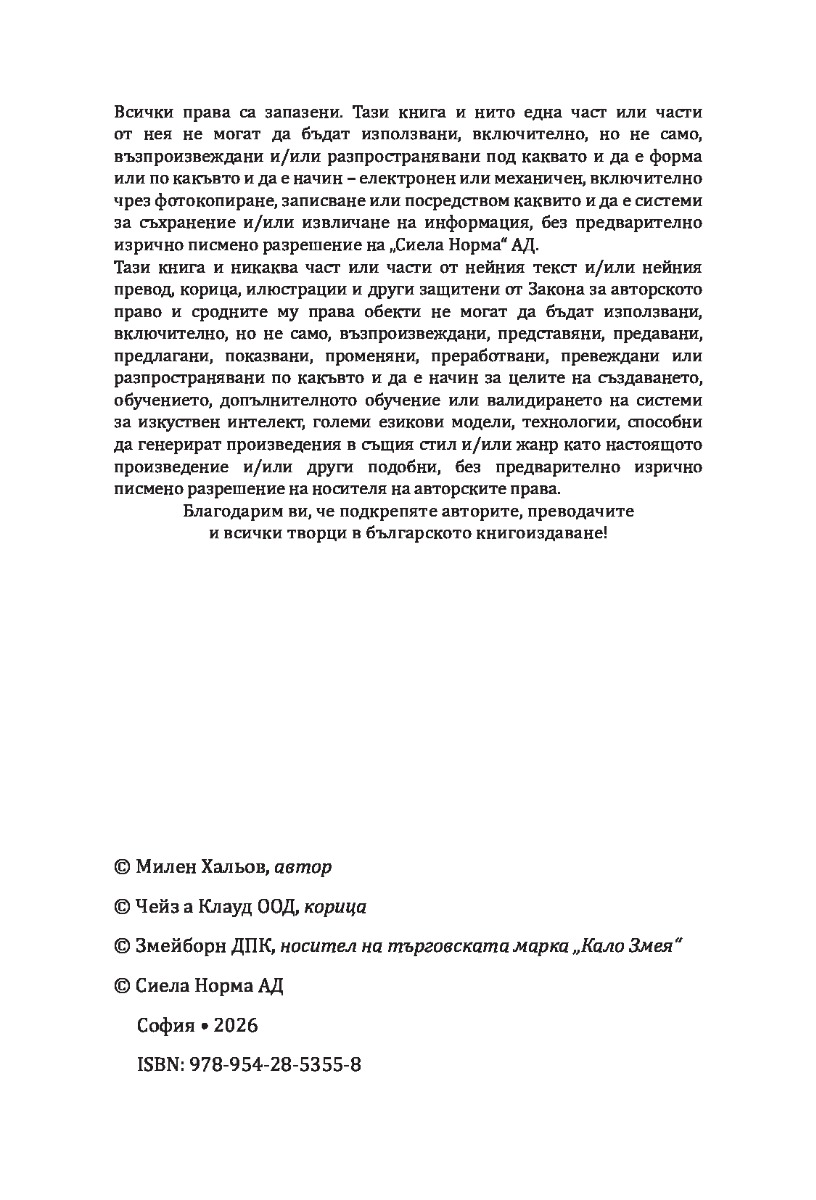 - Художник на корица: Микол Ганзерли, студио „Чейз а Клауд“ ООД;