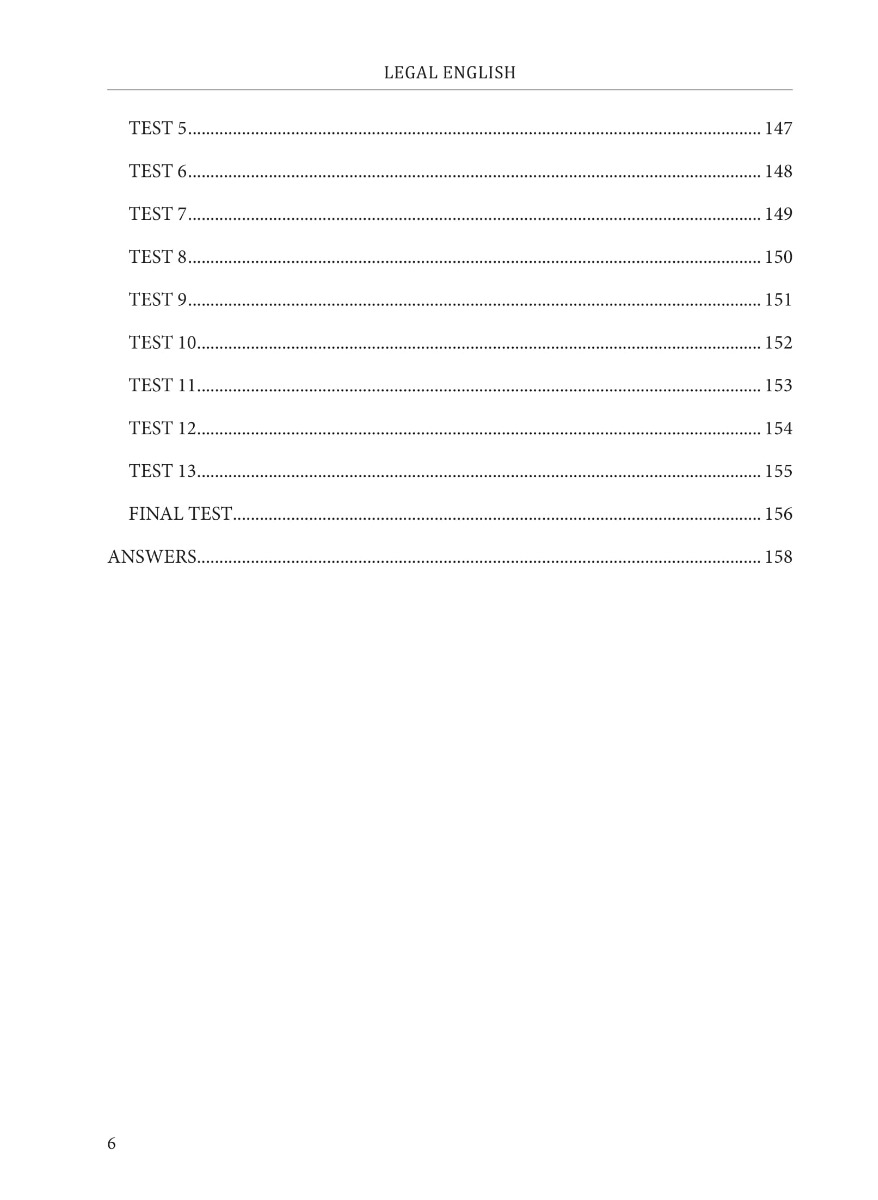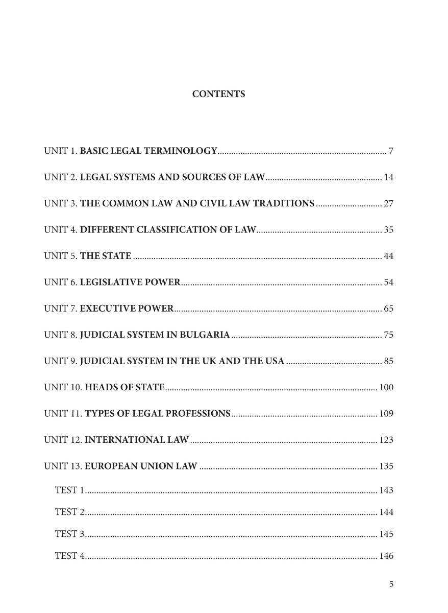 Legal English се състои от 13 теми, съдържащи тематични текстове, упражнения, свързани с работа по текстовете, термини и дефиниции, лексикални и граматични упражнения и преводи. В края на всяка тема има списък с основната правна терминология, употребявана в урока.