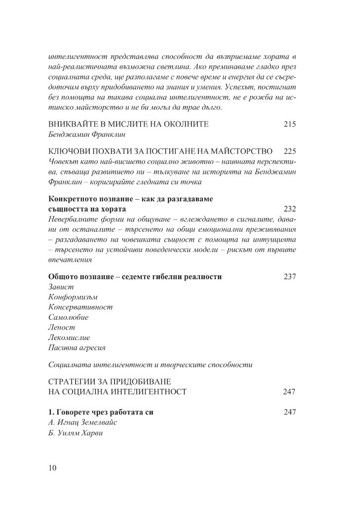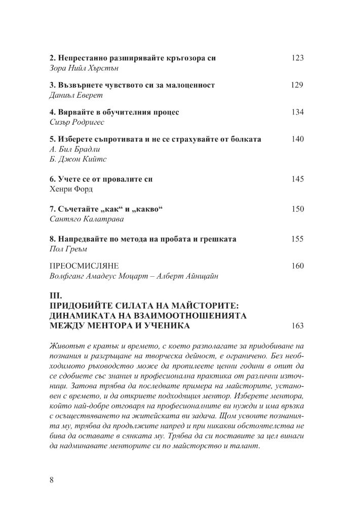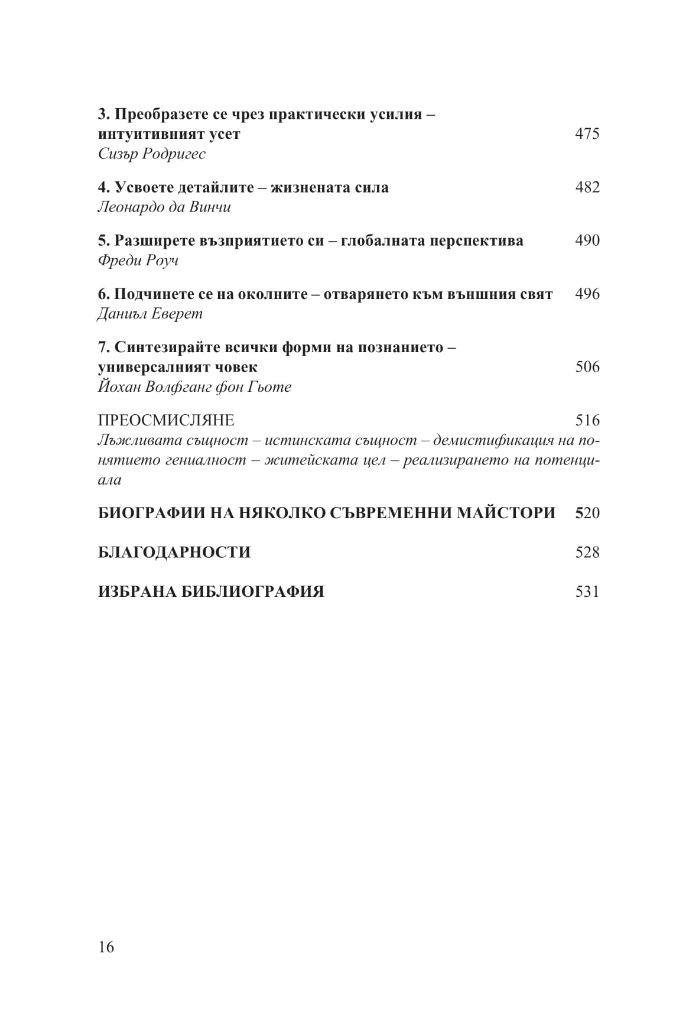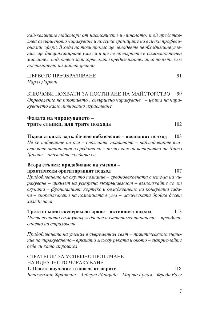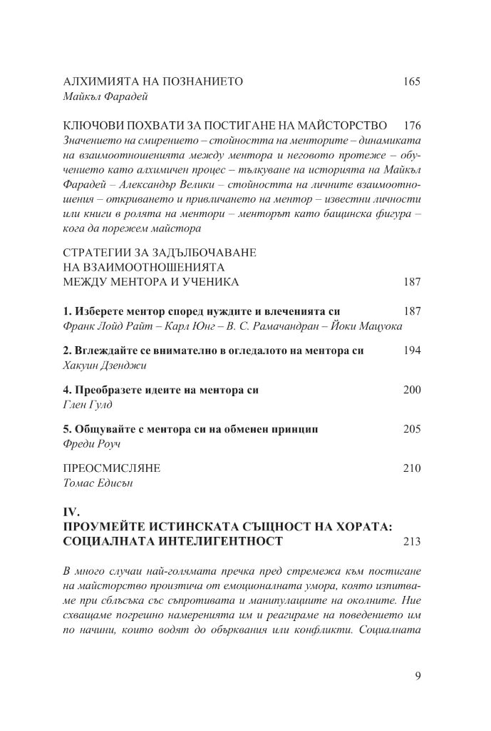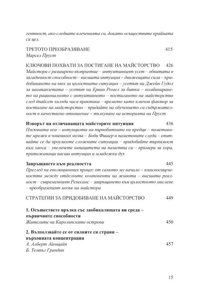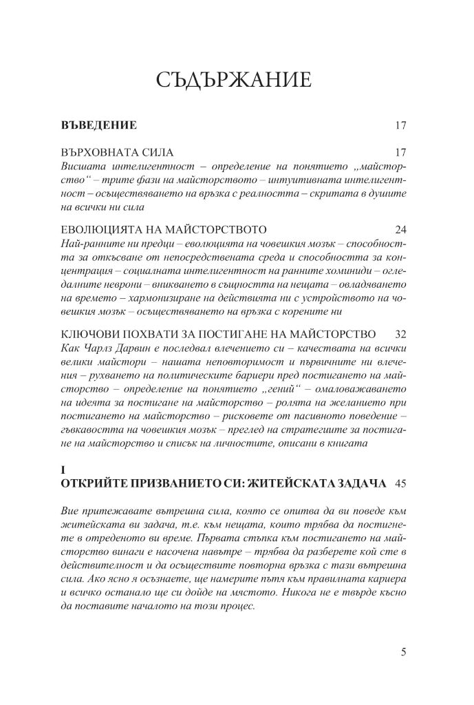 Книгата ще ви покаже как да се обучавате на по-високо ниво, ще ви разкрие вечните стратегии за решаване на творчески проблеми и за поддържане на гъвкав и приспособим ум; ще ви покаже как да придобиете достъп до по-неосъзнати и първични слоеве на интелекта и как да понасяте неизбежните злостни коментари на завистниците, които ще се излеят върху вас; ще ви покаже ясно способностите, които ще ви споходят с помощта на майсторството, и ще ви тласне по посока на този интуитивен, вътрешен усет за избраната от вас сфера на действие.