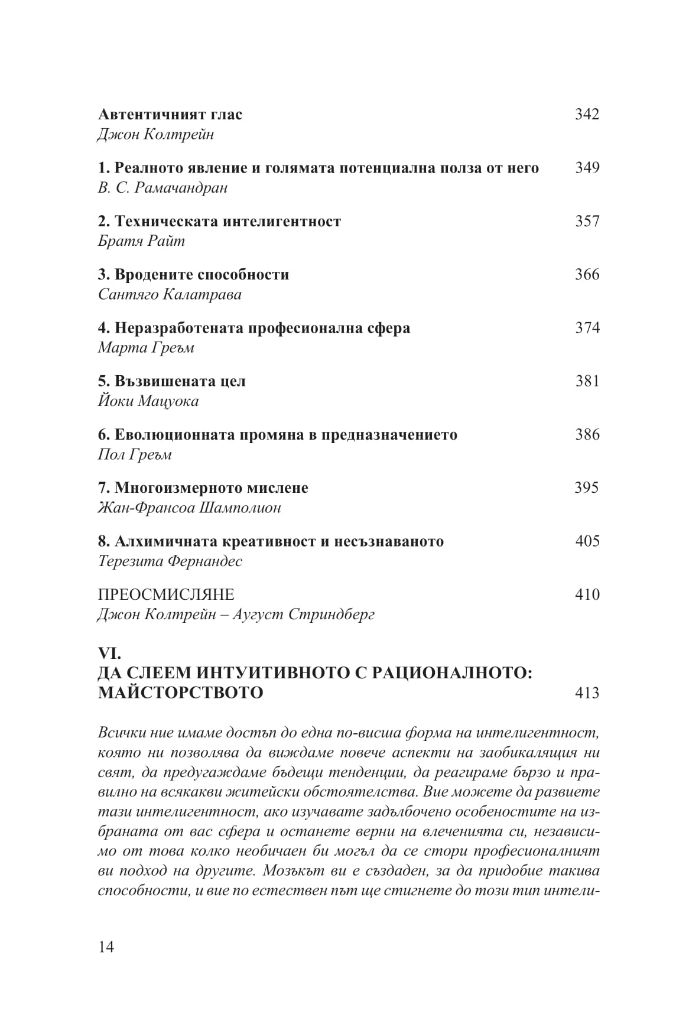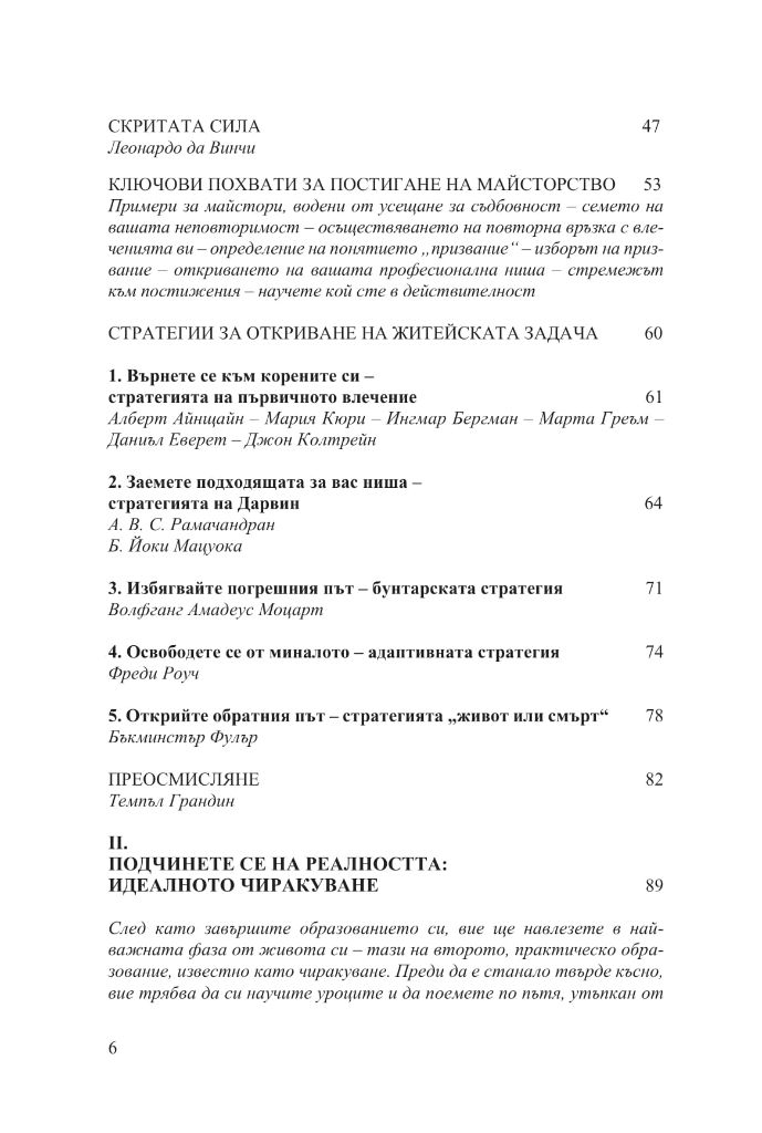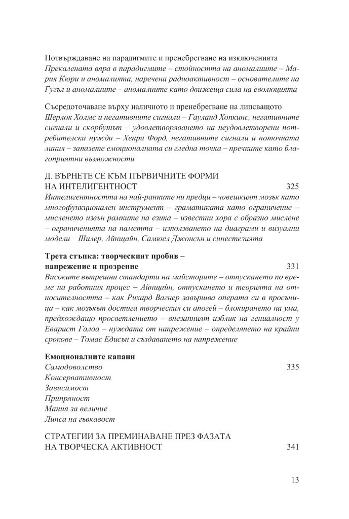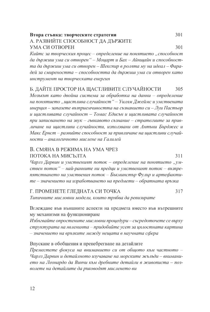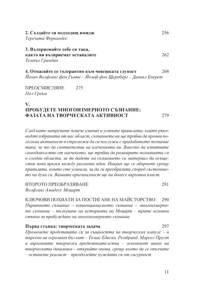 Най-сетне ще ви посвети в една философия и начин на мислене, благодарение на които да следвате по-лесно този път. Идеите в книгата се основават на обширни проучвания в сферата на неврологията и когнитивните науки, на изучаване на творческите процеси, както и на биографиите на великите майстори от миналото. Сред тях са Леонардо да Винчи, дзен учителят Хакуин, Бенджамин Франклин, Волфганг Амадеус Моцарт, Йохан Волфганг фон Гьоте, поетът Джон Кийтс, ученият Майкъл Фарадей, Чарлз Дарвин, Томас Едисън, Алберт Айнщайн, Хенри Форд, писателят Марсел Пруст, танцьорката Марта Греъм, изобретателят Бъкминстър Фулър, джаз музикантът Джон Колтрейн и пианистът Глен Гулд.