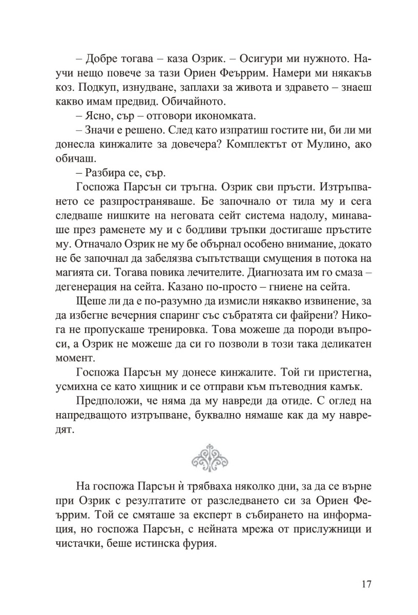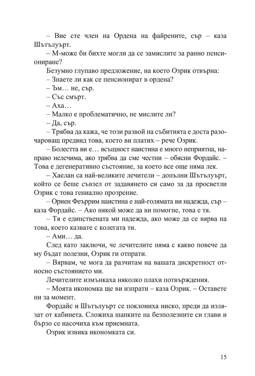 Има ли нещо по-опасно от изпечен убиец, поставен в безизходна ситуация? Да – този убиец да е Озрик Мордонт, член на печално известния Орден на файрените, а безизходната ситуация – мистериозно магическо заболяване, което скоро ще го остави безсилен и беззащитен.