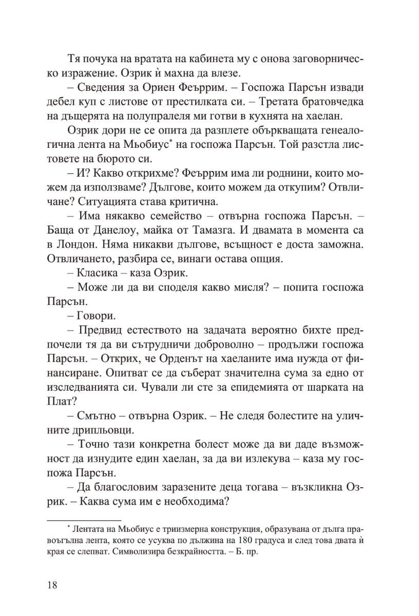 След един доста нескопосан опит за отвличане Озрик е принуден да прибегне към далеч по-отчаяни мерки – подкуп. Огромен, щедър подкуп, с който Ориен би могла да финансира лечението на епидемията от шарка, която покосява единствено деца. Принудена от обстоятелствата, Ориен приема… въпреки че не може да понася нито самия него, нито онова, което представлява.