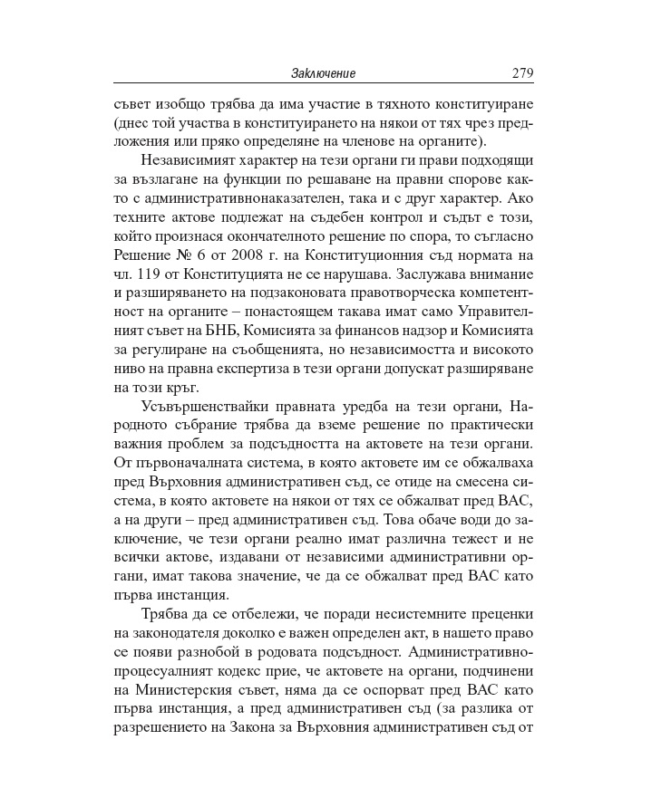 Главно място в монографията е отделено на статута на Сметната палата, Комисията за финансов надзор, Комисията за защита на конкуренцията, Фискалния съвет, на управителните органи на Българската народна банка и др.