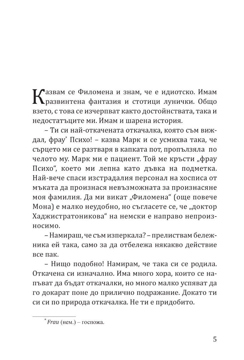 Още една шеметна и затрогваща история от обичаната авторка на „Смок“. Между двата романа обаче няма нищо общо, да е ясно! И остава само теоретичната чуденка какво би станало, ако Филомена и Бела вземат, че някак се срещнат?