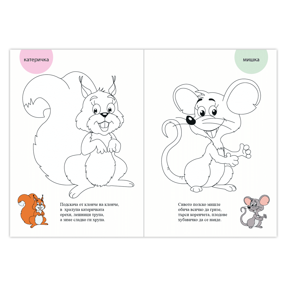 Докато оцветяват рисунките, децата ще се забавляват със стихчета. Така ще научат нови неща за вида, окраската и особеностите на горските животни.