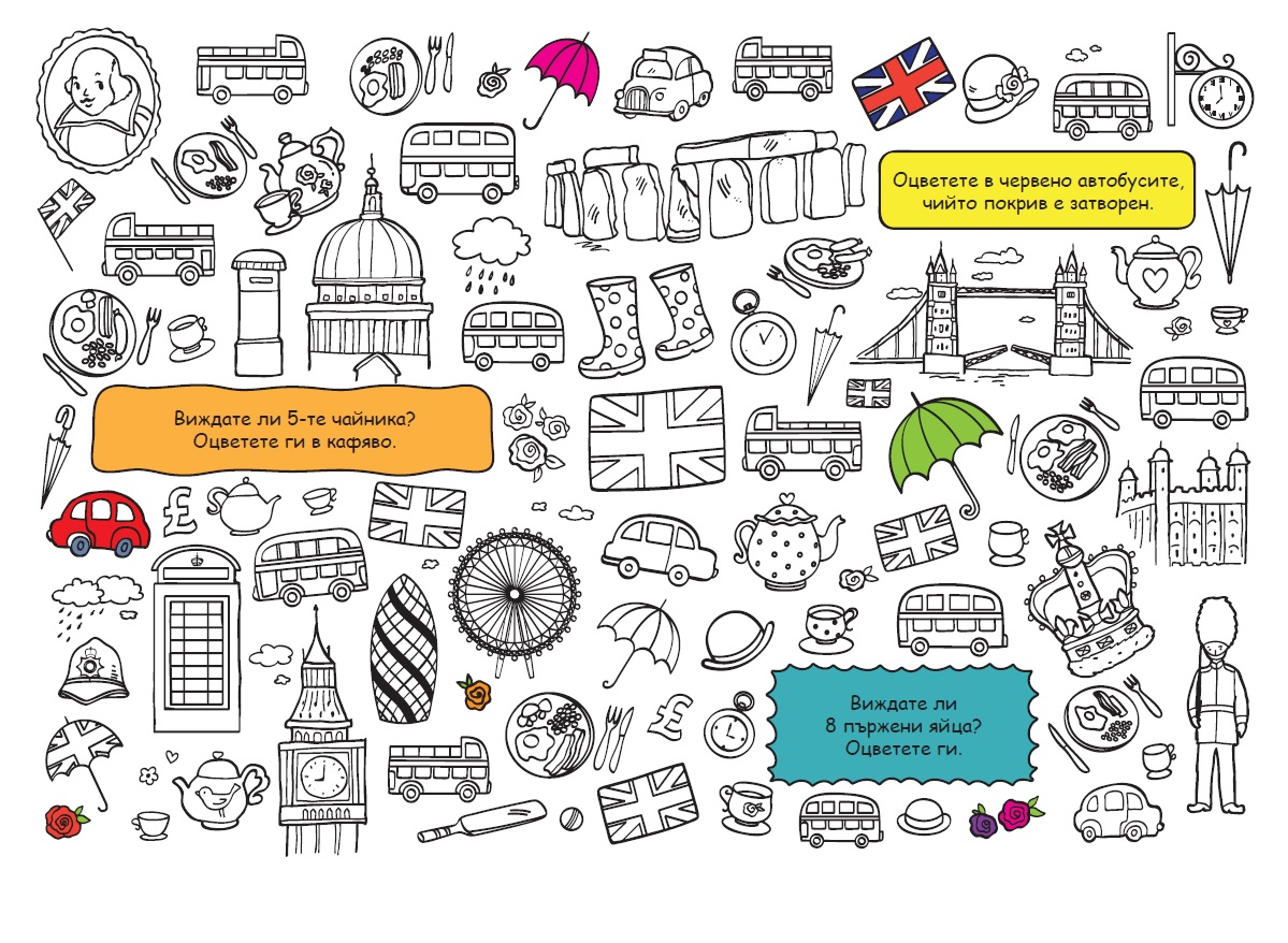 В тази книга ще пътешествате и ще откривате характерни забележителности за различни държави по света - египетски сфинкс, китайски дракони, холандски вятърни мелници, африкански маски, венециански гондоли, руски матрьошки, лондонски двуетажен автобус.