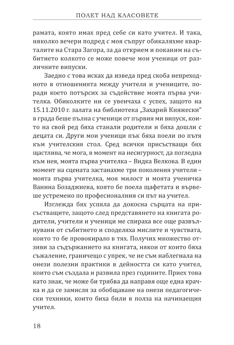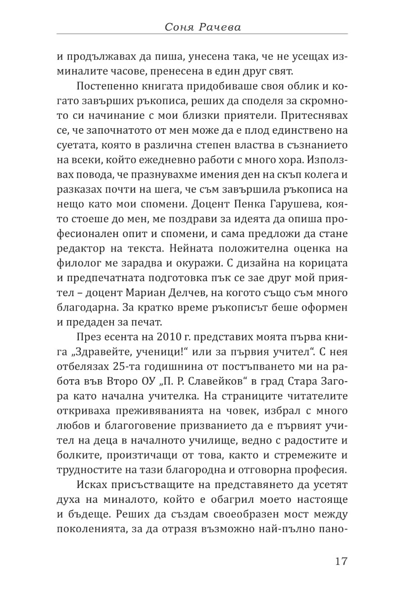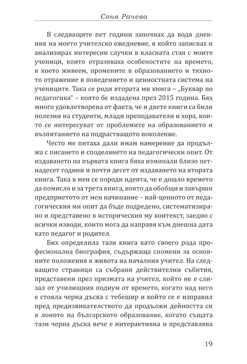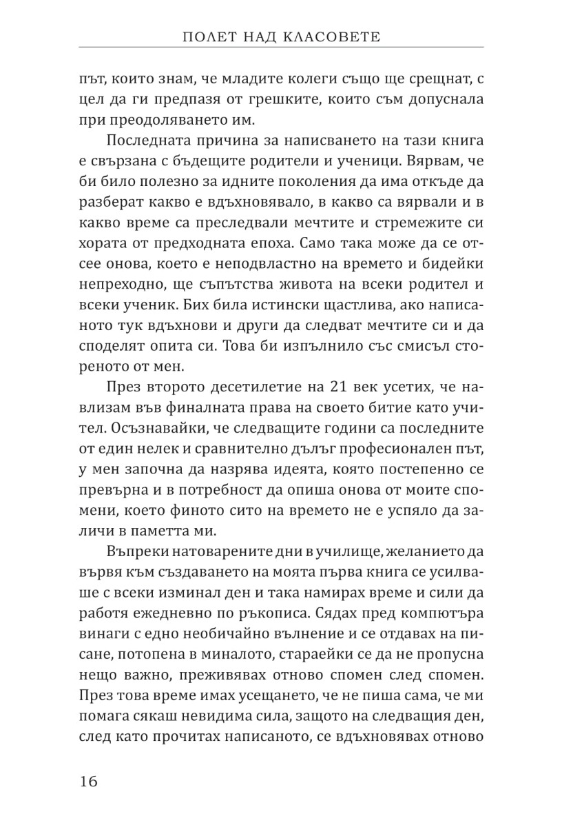 Соня Г. Рачева е родена в Стара Загора и повече от четири десетилетия работи като начална учителка в родния си град. В книгата „Полет над класовете“ описва професионалния си път на педагог, орисан да живее на границата между два века, път който започва от класната стая с черната дъска и тебешира, за да стигне до навлизането на електронните технологии в българското училище. На страниците на книгата са пресъздадени случки и събития такива, каквито са били в действителност, но и емоционално обагрени от преживяванията на няколко поколения деца и родители. „Полет над класовете“ ще предизвика интереса не само на избралите попрището на учителската професия, за да им помогне да вникнат по-дълбоко в същината ѝ, тази книга би била интересна и на онези, които не са безразлични към училищния живот и желаят да го съпреживеят, потапяйки се в написаното.