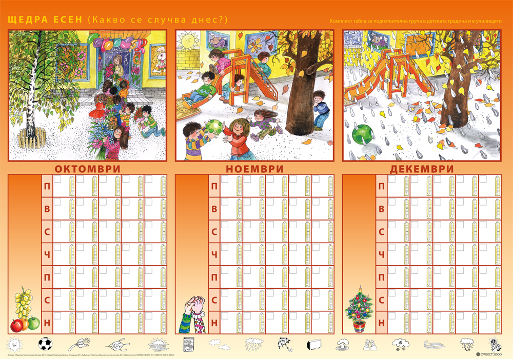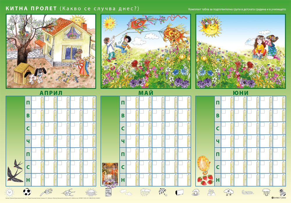 Другите четири табла осигуряват фронталната работа по дейности, предвидени в програмната система по образователни направления Природен свят и Социален свят, но могат да бъдат използвани и по темите от направление Математика. Те дават възможност на учителя и децата да оформят природен календар на групата, чрез които да се систематизират представите за промените в природата през различните сезони, месеци и дни. В календара има възможност да се отразяват и явления от неживата природа. Календарът може да се използва и за развиване на умения за ориентиране в празнично обредната система на страната.