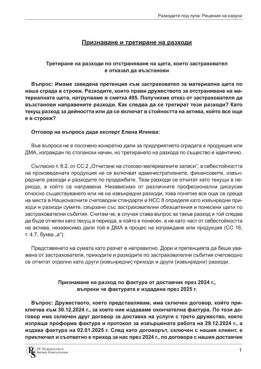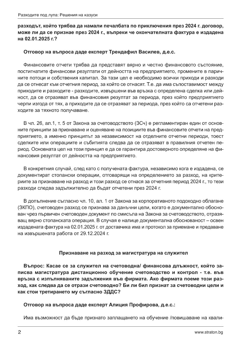 • Признаване на разход по фактура от доставчик през 2024 г., въпреки че фактурата е издадена през 2025 г.;