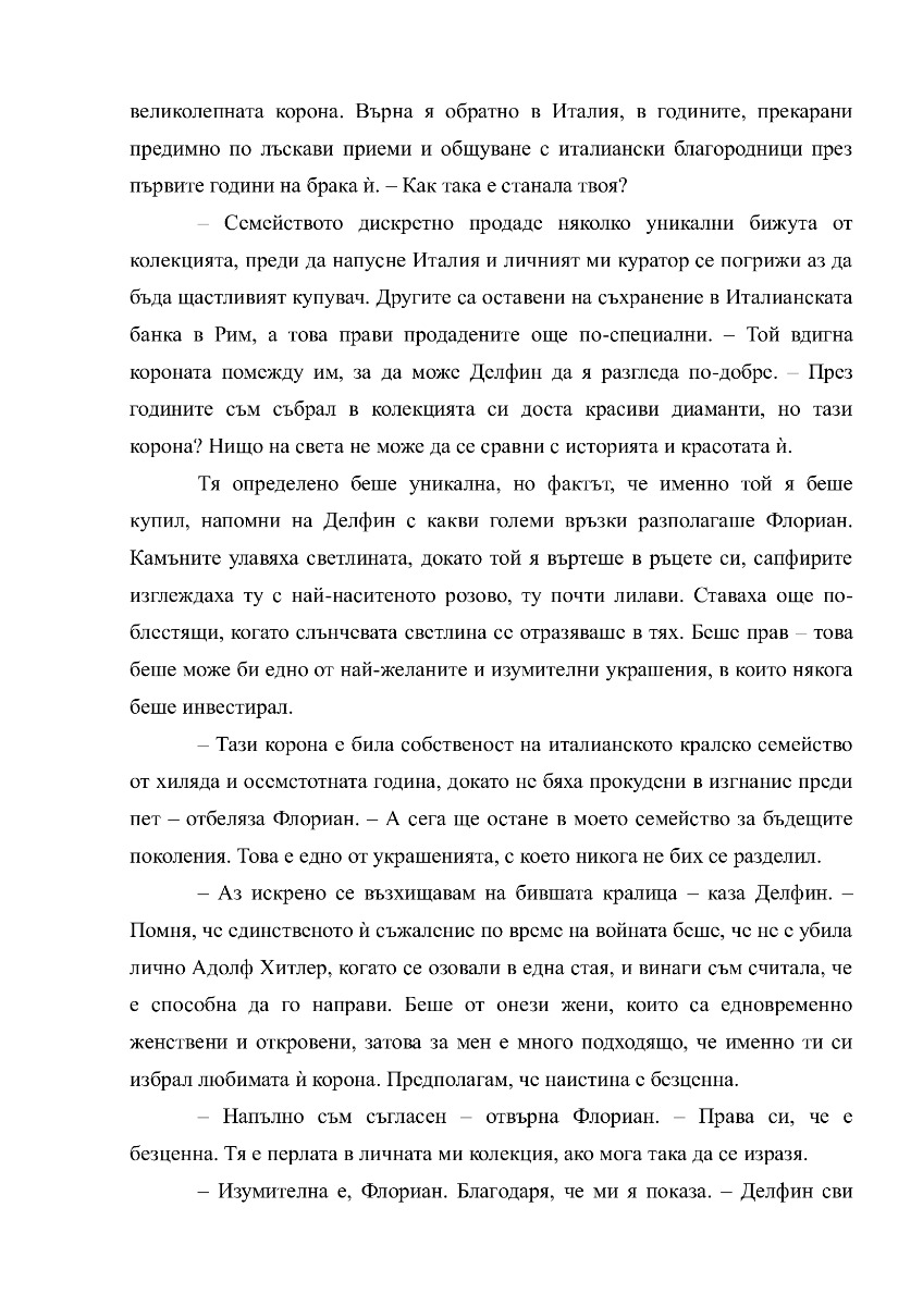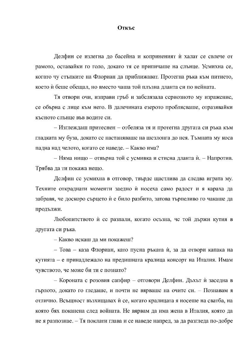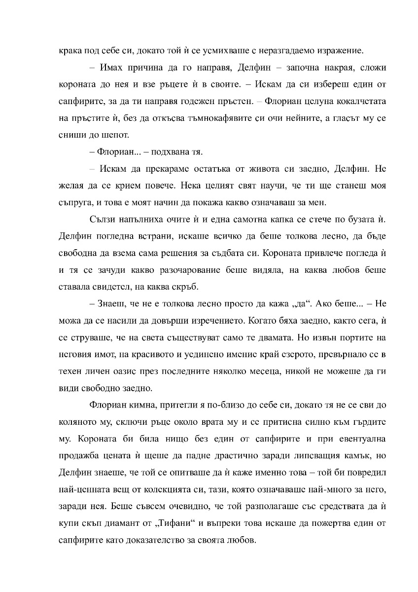 За нейна огромна изненада се оказва, че това не е просто скъпоценен камък, а изчезналият розов сапфир от короната на италианската кралица. За да разнищи мистерията, Джорджия заминава за Женева, където се запознава с привлекателния бижутер Лука. Семейството му съхранява короната и търси изчезналия сапфир от години. Двамата разкриват пазена с десетилетия тайна за страстната, но забранена любов на Делфин и Флориан, завършила трагично. Джорджия и Лука прекарват една вълнуваща седмица на брега на Женевското езеро, там, където преди повече от седемдесет години започва красивата любовна приказка.