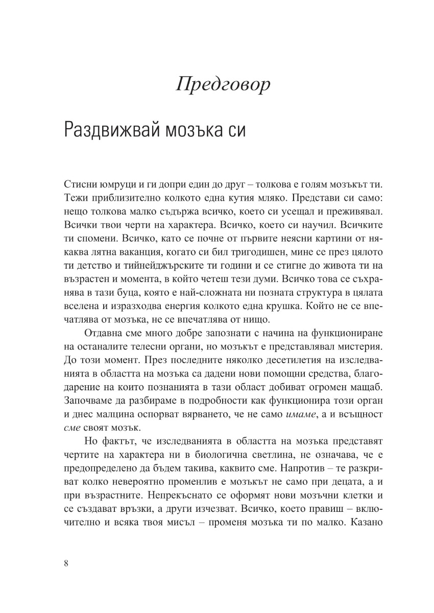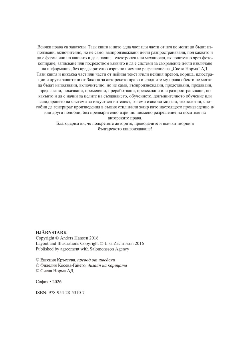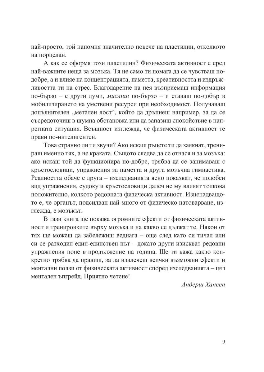 В „Силен мозък“ водещият шведски психиатър Андерш Хансен разкрива как една обикновена разходка или леко бягане могат да променят всичко. Той обяснява ясно и разбираемо какво точно се случва в мозъка ти, когато се движиш, защо се чувстваш по-добре и по-умен – и ти дава прости, работещи съвети какво да правиш, за да имаш силен и здрав ум!