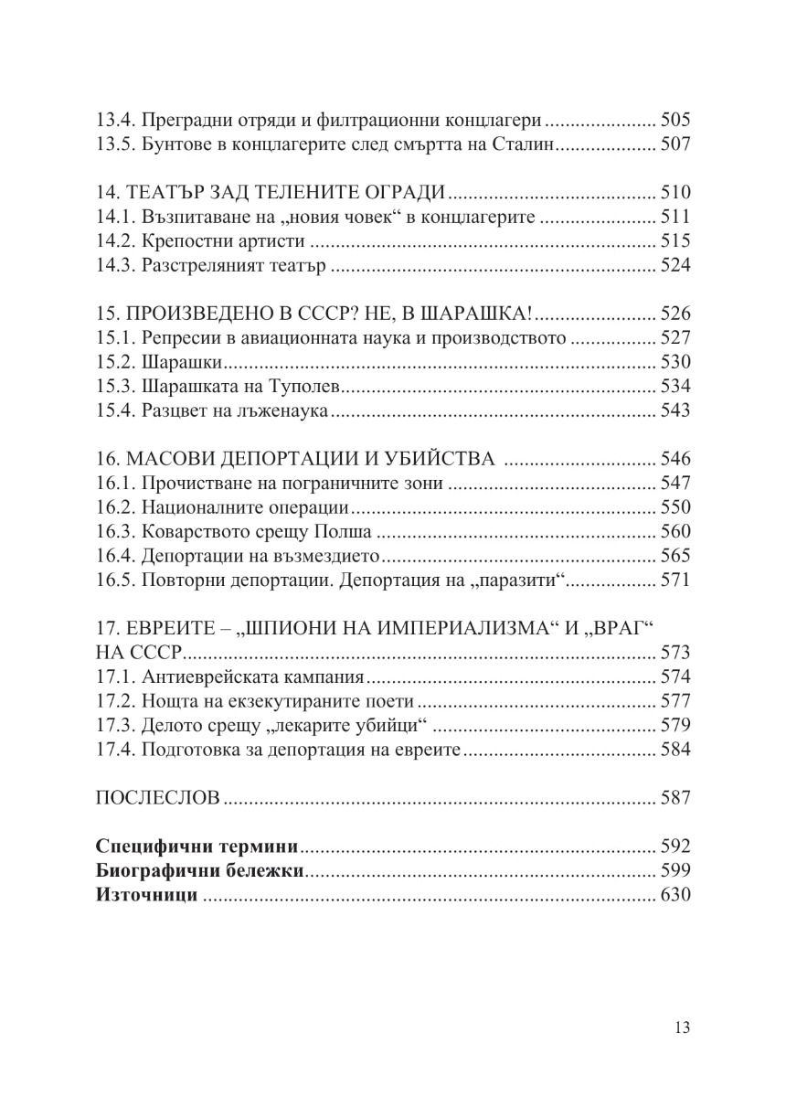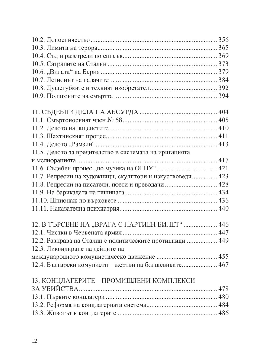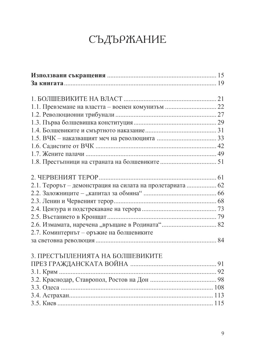 Настоящата книга разглежда събитията в Съветска Русия и СССР от 1917 г. до смъртта на Сталин през 1953 г. Хронологично са представени болшевишкият преврат през октомври 1917 г., Червеният терор и военният комунизъм, присъединяването на престъпници към Червената армия и ВЧК и престъпленията им през Гражданската война, терорът над буржоазията и интелигенцията, разгромът на Църквата и безбожническото движение. Описани са масовите екзекуции, които „червените“ палачи изпълняват в цялата страна, Гладоморите през 20-те и 30-те години, трагедията на милиони селяни при колективизацията и разкулачването, арестите, следствията, съдебните дела на абсурда, концлагерите и свързаните с тях мъчения и извращения, сексуалната революция на болшевиките. Специално внимание е отделено на Големия терор през 1937–1938 г., трагедията на скитащите из цялата страна безпризорни деца, масовите депортации на цели народи и ликвидирането на елита на Коминтерна и дейците на международното комунистическо движение, в т.ч. на стотици български комунисти, обявени по-късно от българската комунистическата пропаганда за жертви на фашизма.