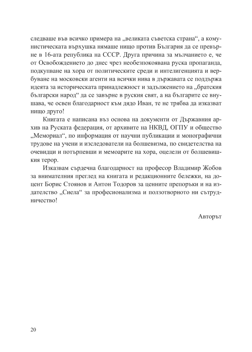 В настоящата книга, на основата на документи, той разказва за създаването на БКП като една от най-верните секции на Коминтерна, за парите от Москва за организиране на въстания, разбойничество и терор срещу буржоазната държава и за съветската агентура в България преди 9 септември 1944 г. Книгата отговаря и на въпросите кои са хората, които след „девети“ овладяват ръководните длъжности в армията, МВР, министерствата и посолствата на НРБ в чужбина, с какво заслужиха привилегиите си активните борци против фашизма и капитализма и защо от техните родове и семейства 45 години се подбираха най-верните кадри на комунистическата власт!