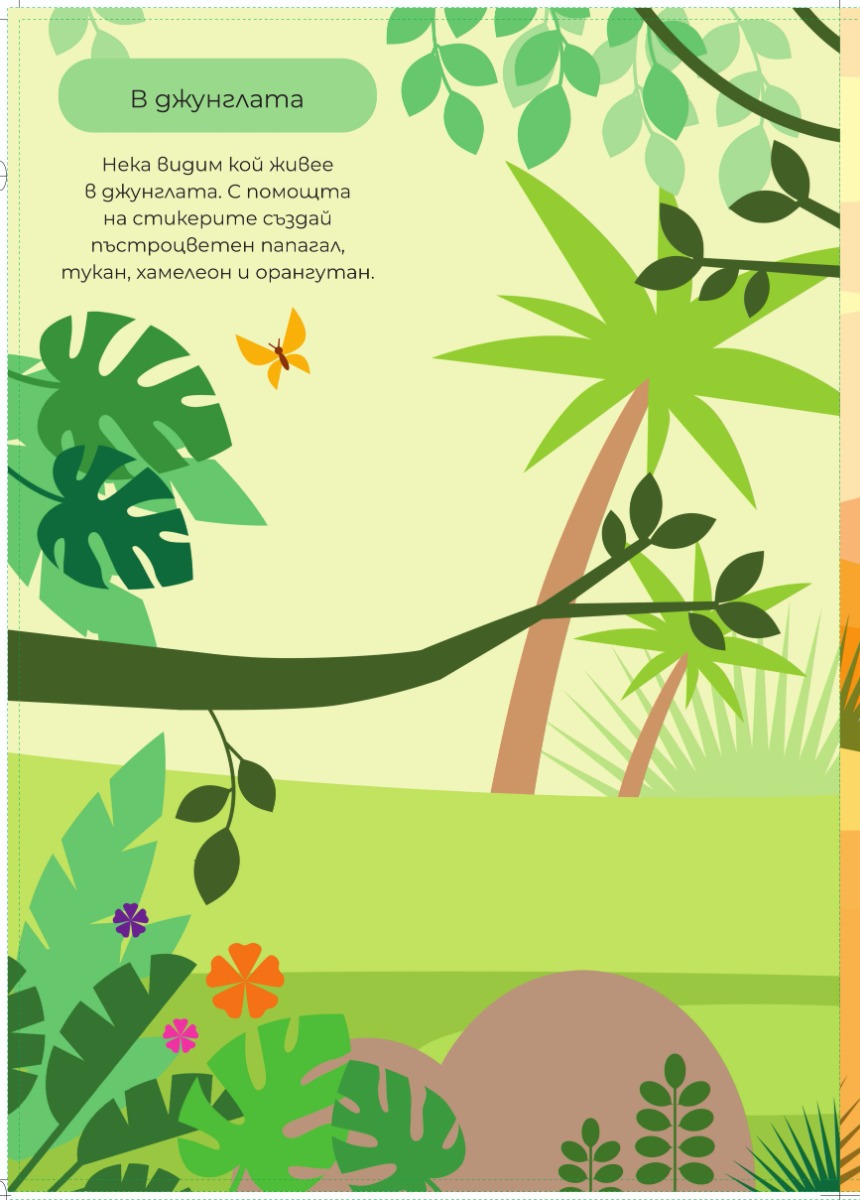 Пъстроцветен папагал, тукан, хамелеон, лъв, крокодил или орангутан – с помощта на „Диви животни“ от поредицата „Стикерни зверчета“ малките любители на природата могат да създават различни животни и да ги разполагат на страниците. Всичко, което им е нужно, са виниловите стикери за многократна употреба, включени в книгата!