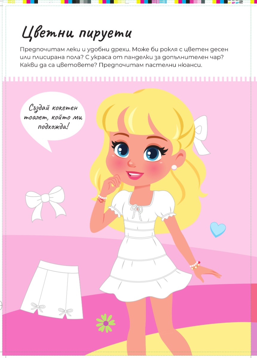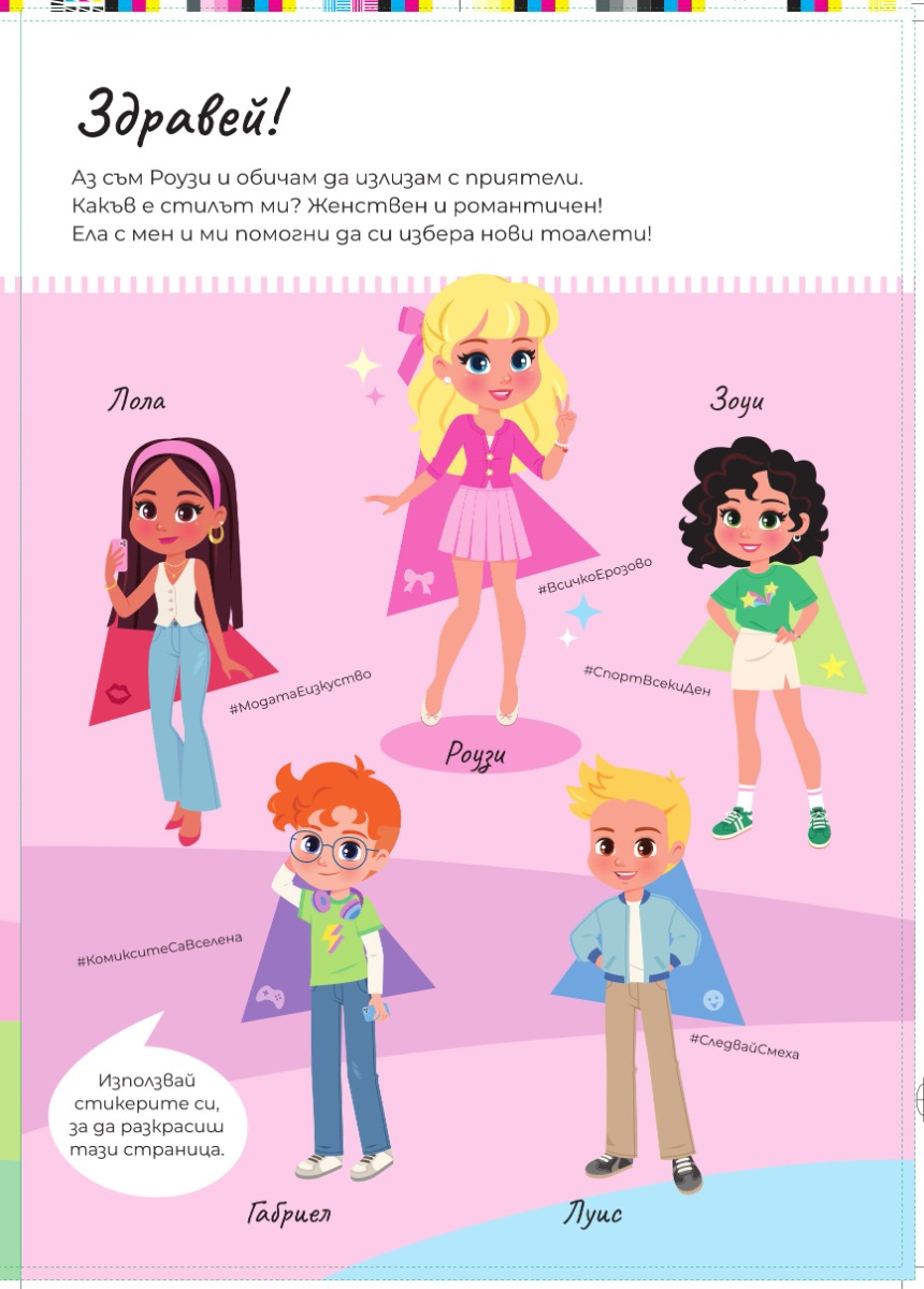 Запознай се с Роузи и нейните приятели! Те са забавни, любопитни и истински любители на модата. Ако това важи и за теб, грабвай цветните си моливи и направи облеклата в тази книга истински модни шедьоври! Ще ти помогнат цветните стикери – цели 150 на брой!