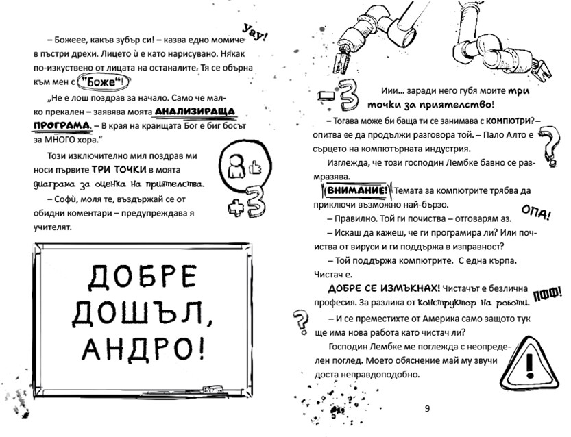 С предмети като смятане, физическо... нямам проблеми. Но намирането на приятели... Изключително ми е сложно с тези странни същества! А няма инструкции за работи с тях. Много неприятно е, че технологията, инсталирана в мен, е остаряла и все дава някаква
