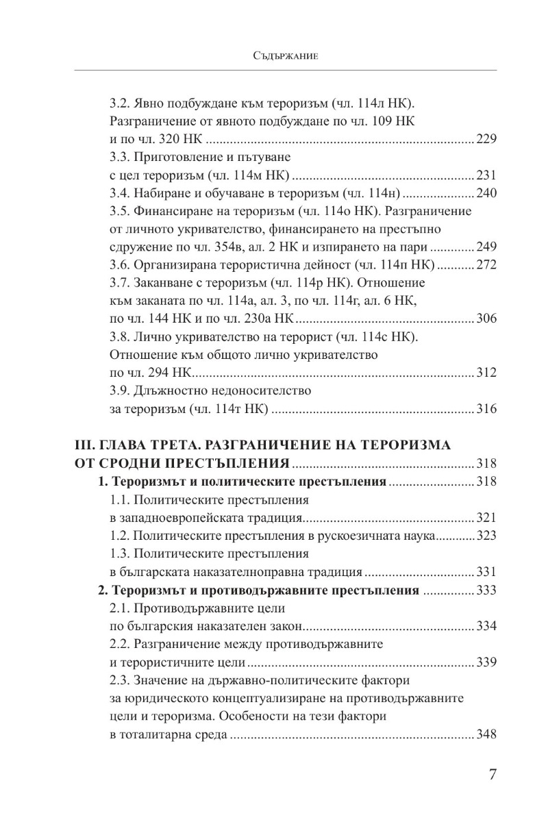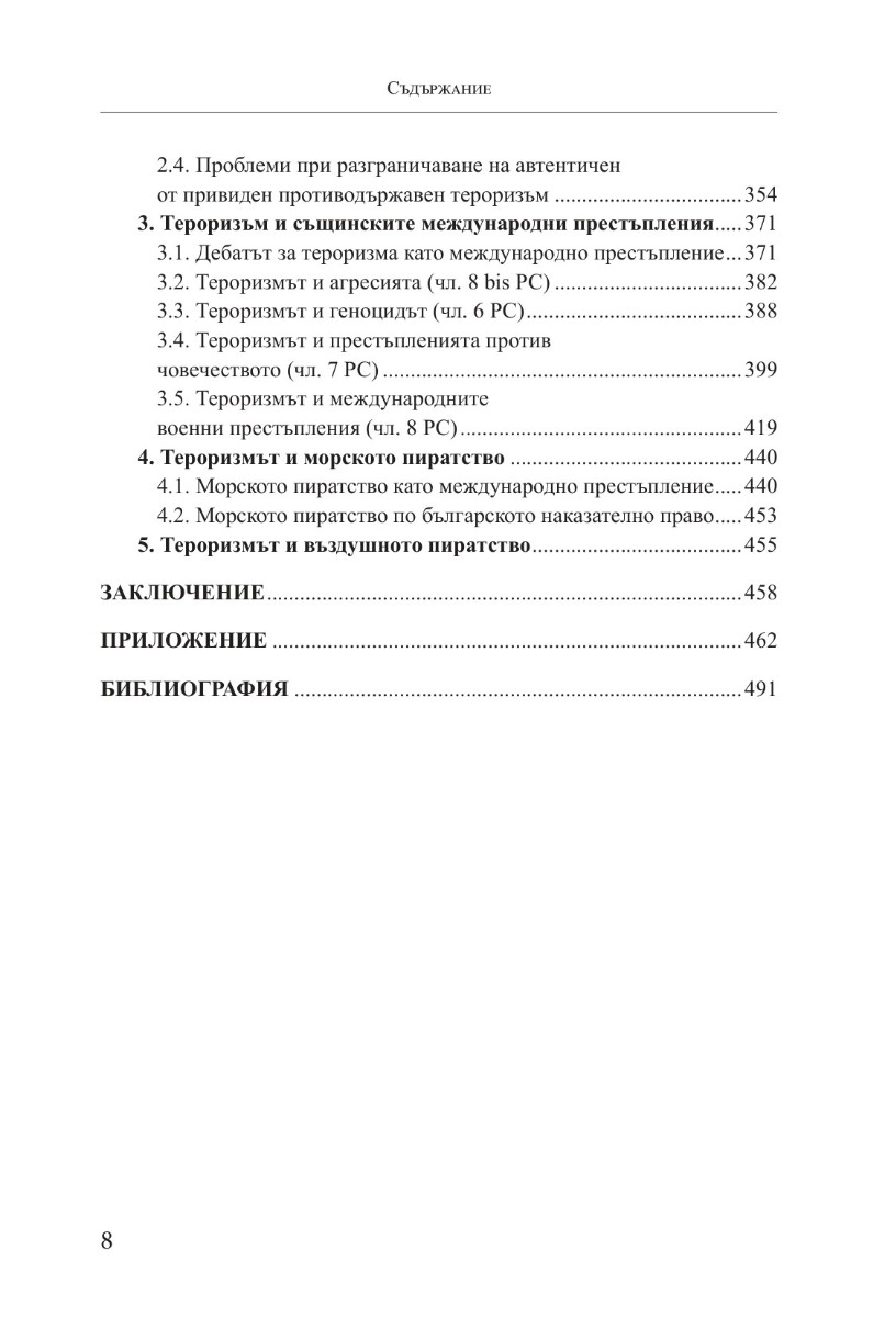 Монографията обобщава изследвания на автора върху еволюцията и особеностите на терористичните престъпления и тяхното разграничение от военно-политическо насилие, изпиране на пари, организирана престъпна дейност, политически, противодържавни и международни престъпления и други сложни съвременни глобални явления.