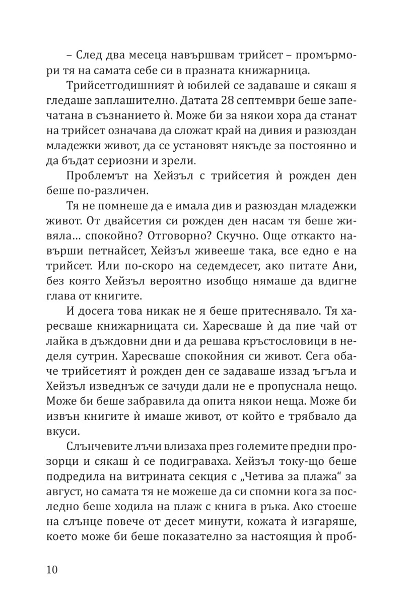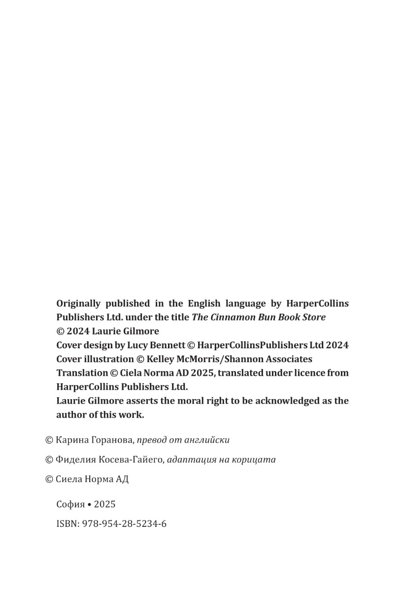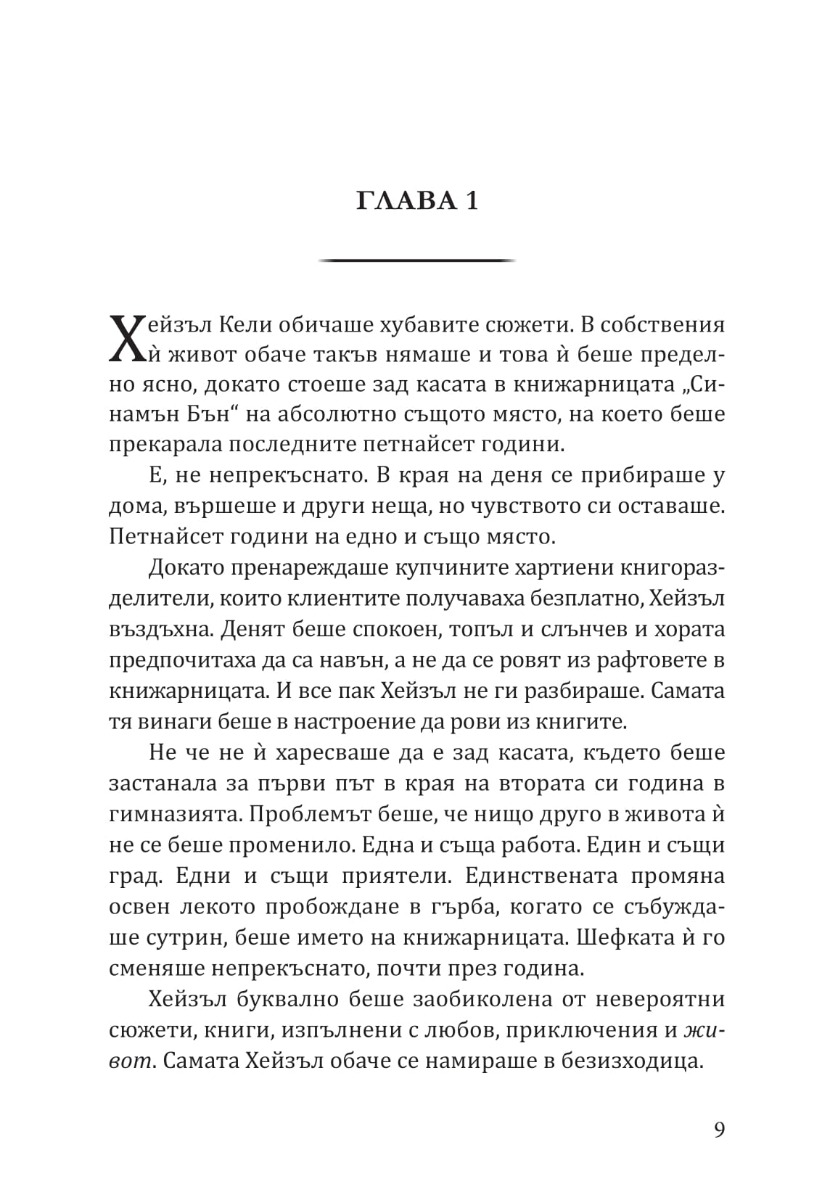 Хейзъл обожава работата си в уютната книжарница „Синамън Бън“, където ароматът на прясно изпечени канелени кифлички се преплита с магията на книгите. Свикнала със своя тих и подреден свят, младата жена е намерила нещо, което много прилича на щастието… макар сърцето ѝ да нашепва, че може би нещо липсва.