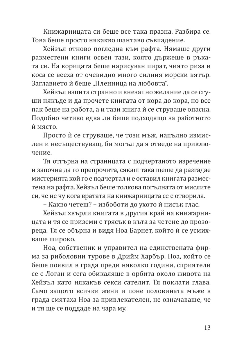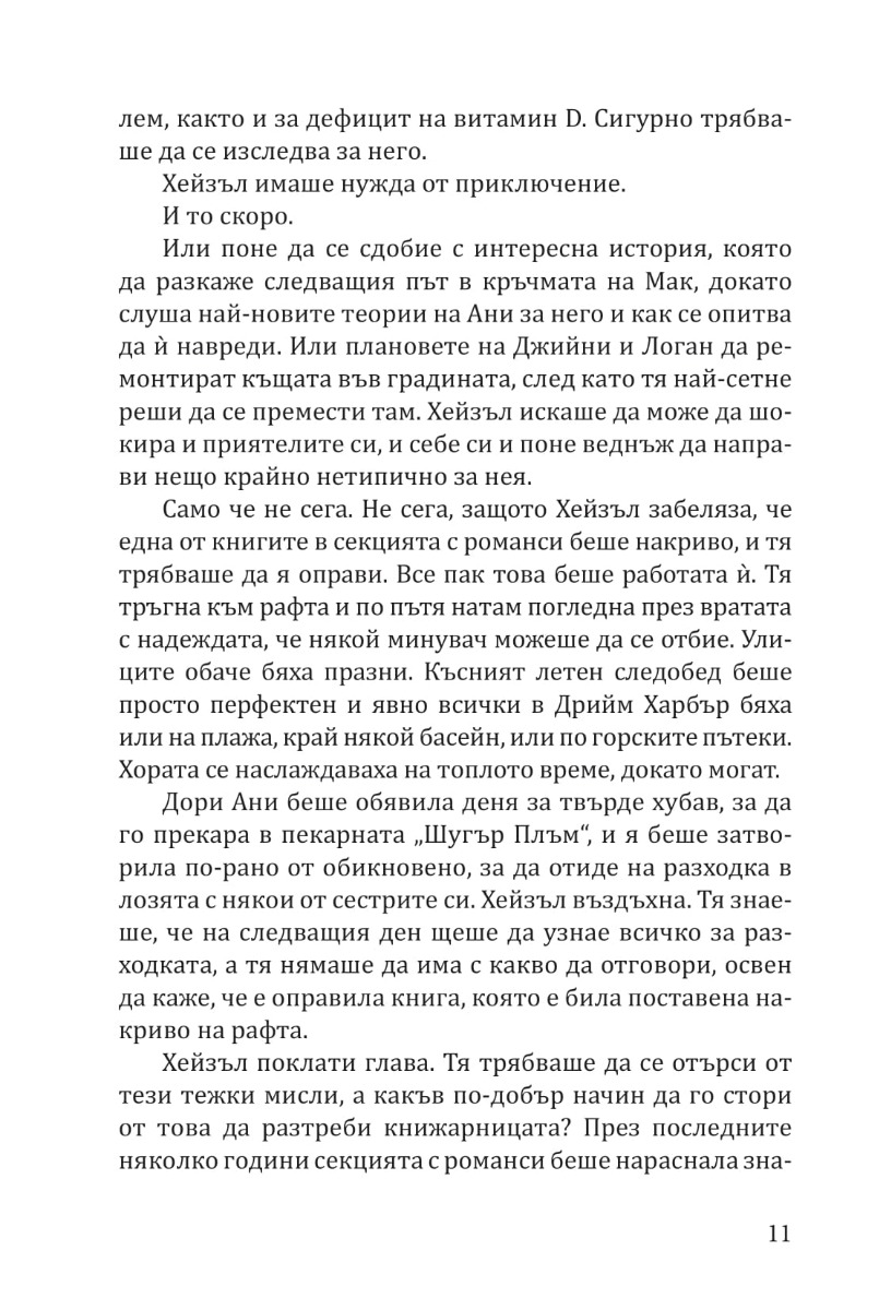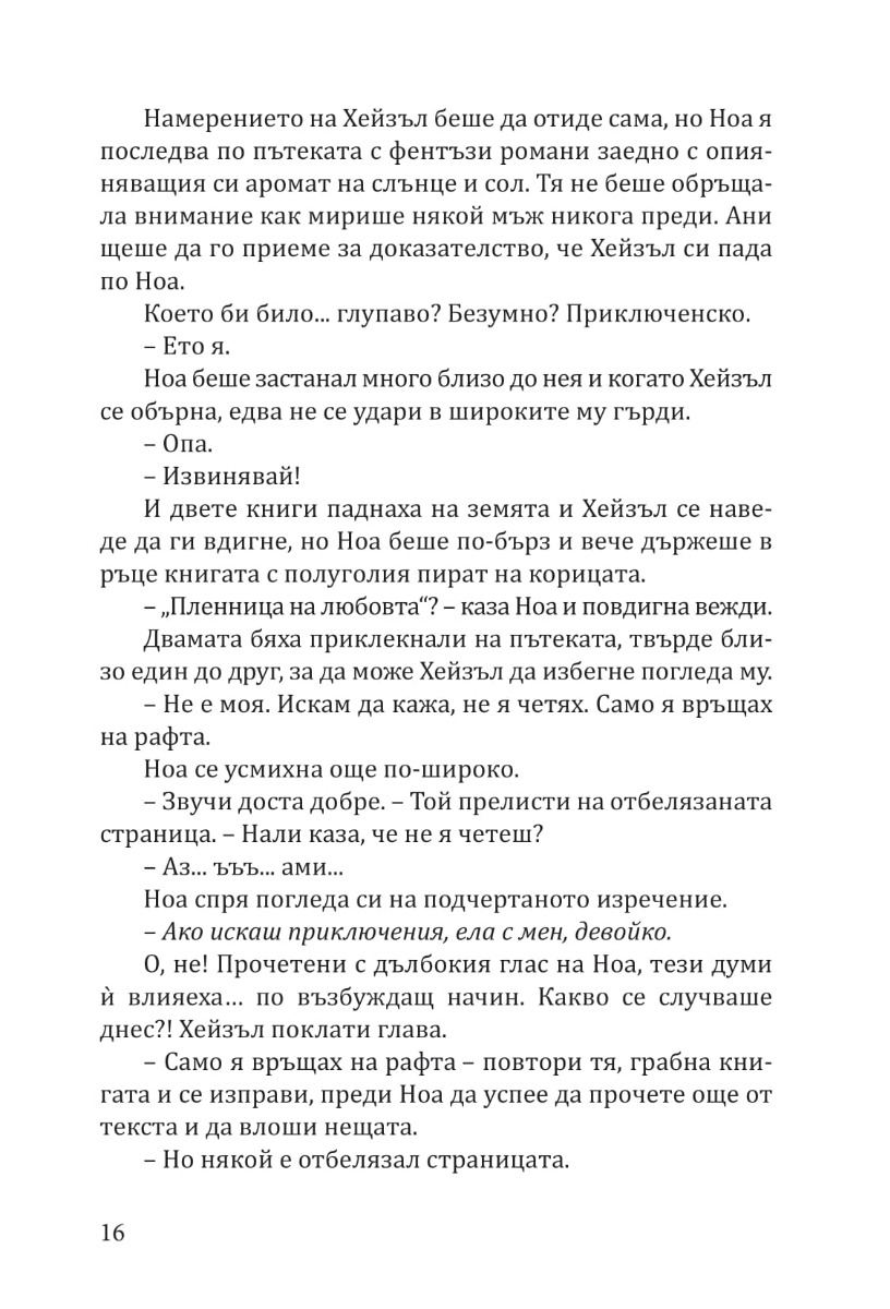 Красивият и обаятелен Ноа е винаги готов за приключение – особено ако му дава и шанс най-накрая да се сближи с чаровната книжарка, по която тайно въздиша от месеци. И докато мистериозните послания ги водят към предизвикателства из романтичното градче и дори в открито море, искрите между Хейзъл и Ноа пламват – горещи и сладки като прясно изпечените канелени кифлички, които превръщат книжарницата в приказно царство.