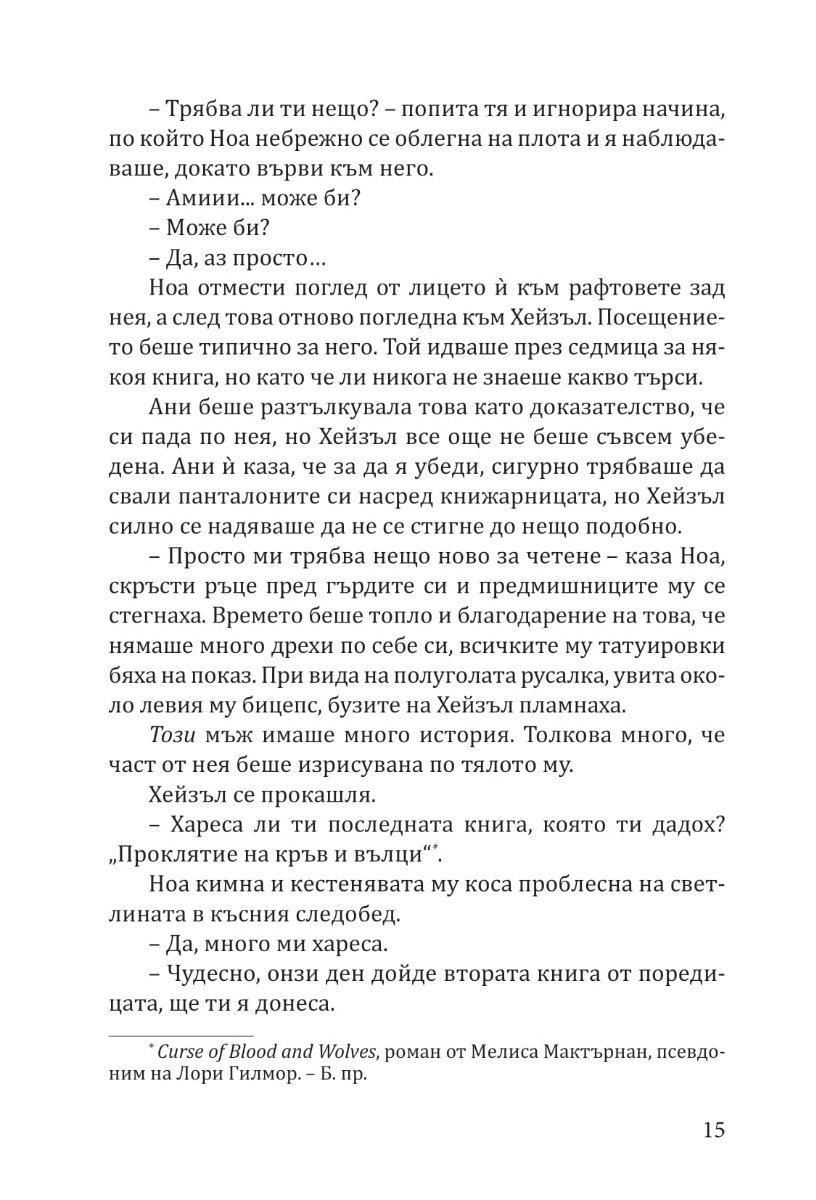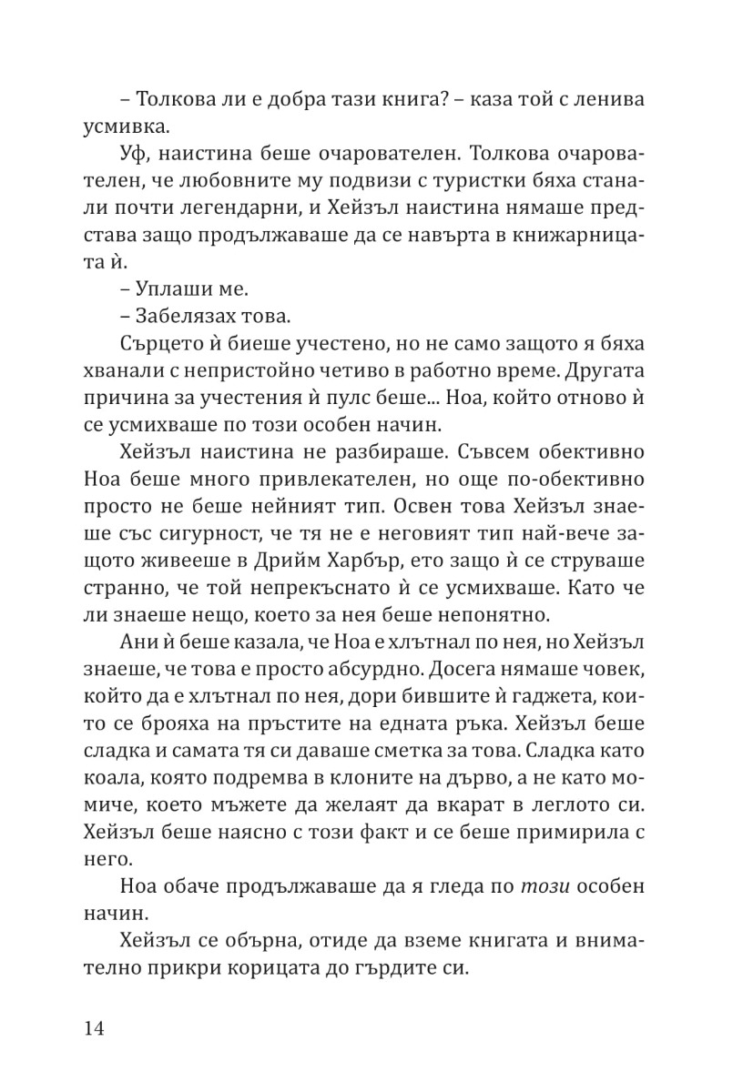 Хейзъл беше тръпчивият вкус на боровинки на ези­ка му, тя беше солен въздух и дъждовни дни, тя беше перфектната книга. Тя беше целувки и тайни усмивки. Тя беше всичко и той просто се нуждаеше от нея.