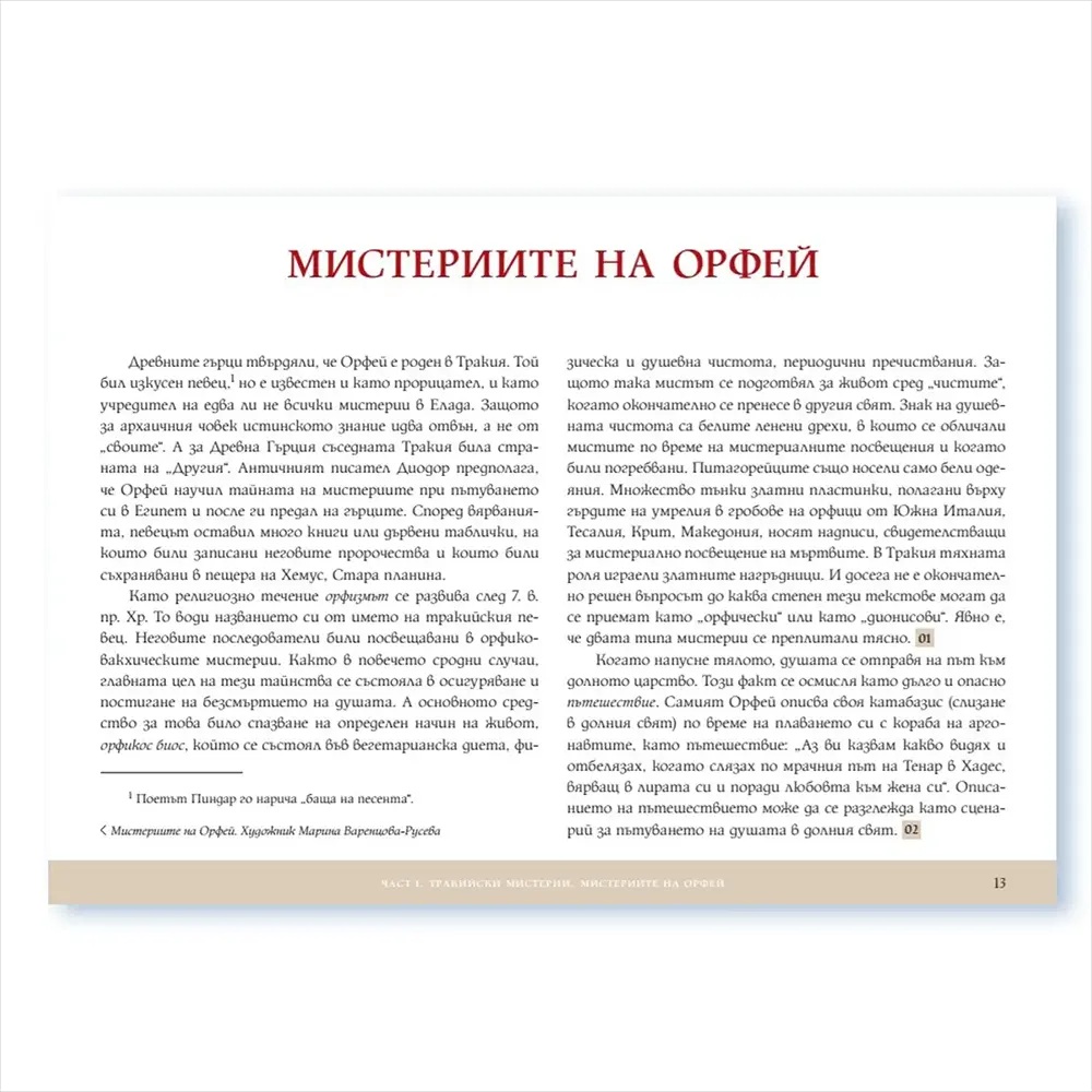В книгата са представени мистериите на Орфей, Дионис, Самотраки, Аполон, Митра, Великата богиня майка, Изида и Озирис, Елевзинските мистерии, както и знакови тракийски владетели по нашите земи.