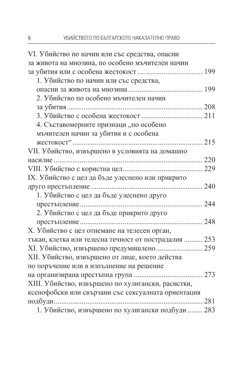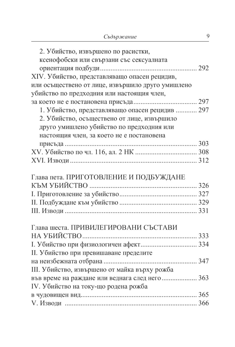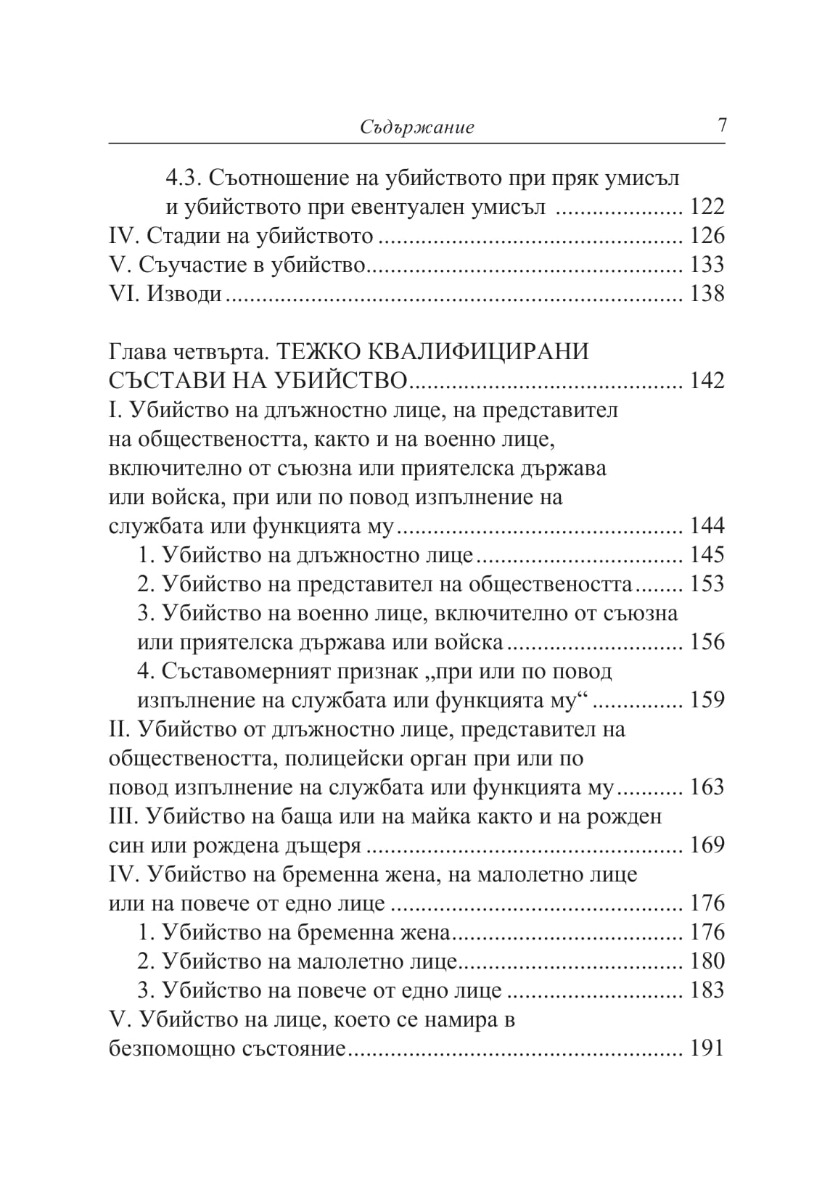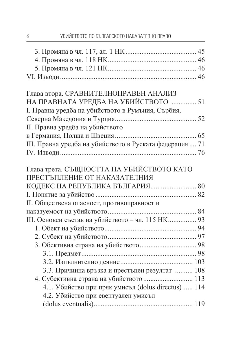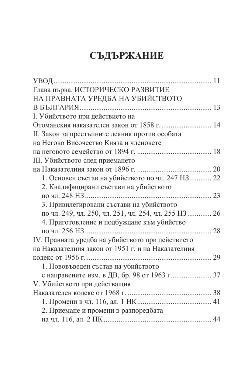 Нормативната регламентация на убийството отразява развитието на наказателноправната политика в държавата предвид естеството на това най-тежко престъпление и относимите към него последици. Настоящият научен труд представлява задълбочен анализ на съществуващите теоретични постановки, като в него е поместена и водеща съдебна практика, релевантна към разглеждания институт. Обърнато е голямо внимание на онези характерни елементи, чиято интерпретация има основно значение за правилната квалификация на деянието. Изследването предлага някои нови идеи за усъвършенстване на актуалната законодателна уредба с цел по-добро правоприлагане. Текстът е структуриран по достъпен начин, така че да бъде интересен и полезен не само за студенти или практикуващи юристи, но и за по-масовата читателска аудитория.